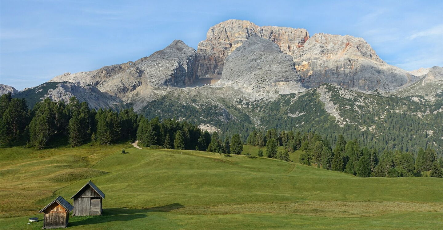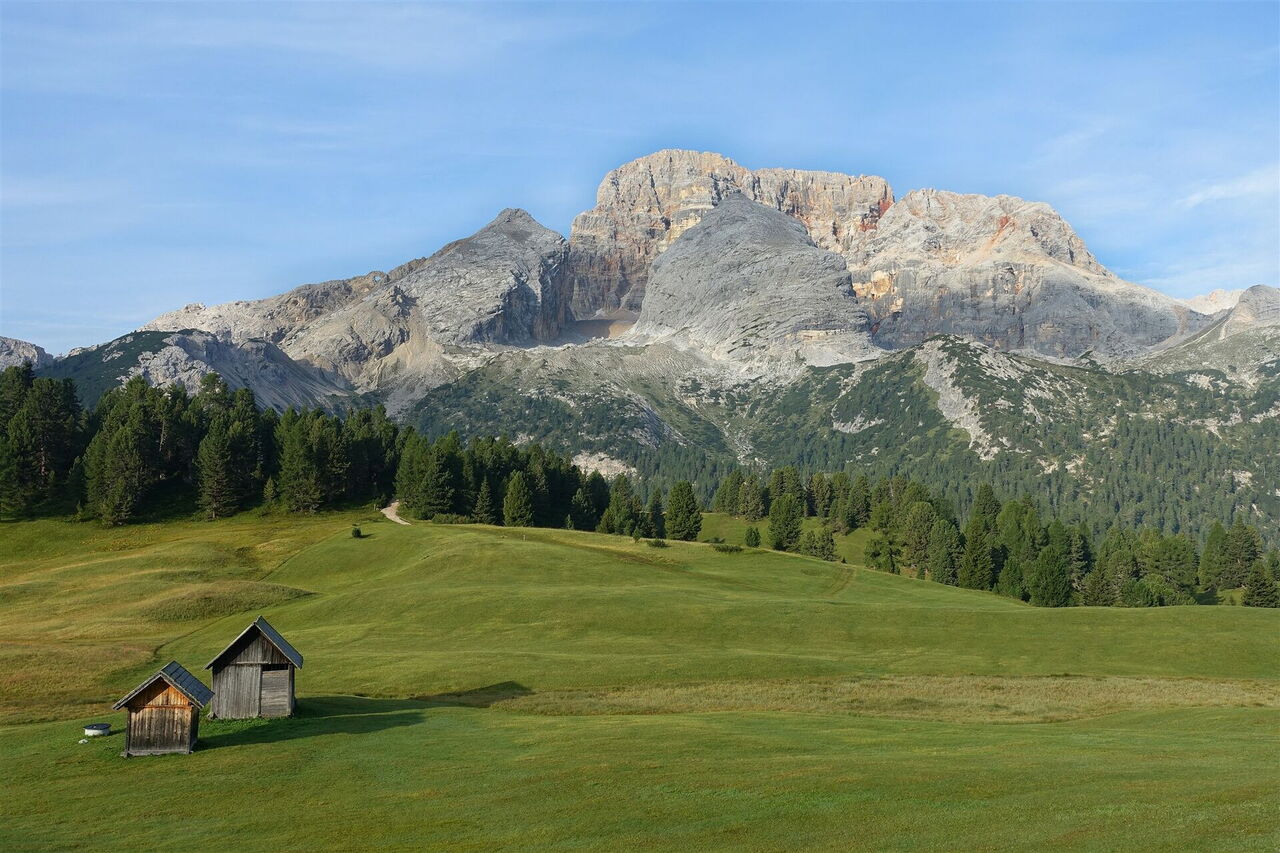Vom 01 Berggasthof Plätzwiese (2.000 m) folgen wir in südlicher Richtung dem Wanderweg 18, es geht über Almwiesen Richtung Gemärk. Halb rechts von uns erhebt sich die 3.140 m hohe Croda Rossa (Hohe Gaisl). Hinter einer einzelnen Hütte gabelt sich der Weg und wir nehmen weiterhin den Wanderweg 18, es geht über eine kleine Brücke und auf einem Pfad weiter. Wir steigen durch das Knappenfußtal ab und gehen bei der Weggabelung auf der Wegnummer 18 a Richtung Autobus. Als Nächstes queren wir ein weiteres Trockenflussbett nach halb rechts, um auf der gegenüberliegenden Uferseite auf den weiterführenden Pfad zu gelangen.