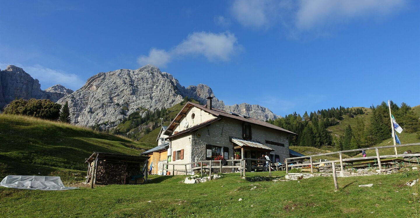 An dieser Wegekreuzung gehen wir geradeaus und erreichen nach einem kurzen Abstieg das idyllisch gelegene 05 Rifugio Bruno Boz (1.718 m).