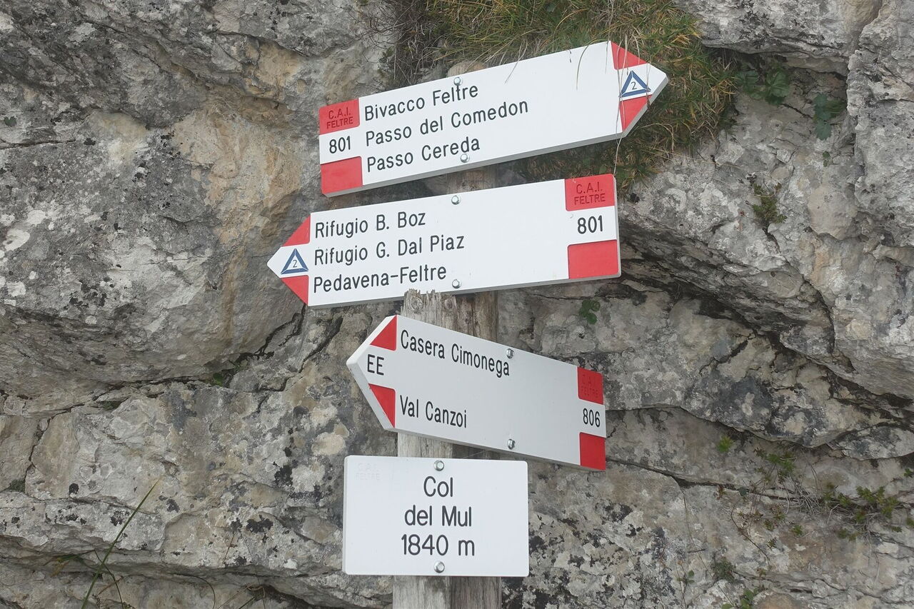 Am 02 Col de Mul (1.840 m) ignorieren wir den linken Abzweiger in Richtung der Casera Cimonega und gehen geradeaus weiter. Wir marschieren ein langes Wegstück durch Latschenkiefern. Auf dem darauffolgenden abzweigenden Pfad ignorieren wir den Weg 806 Richtung Val Canzoi.