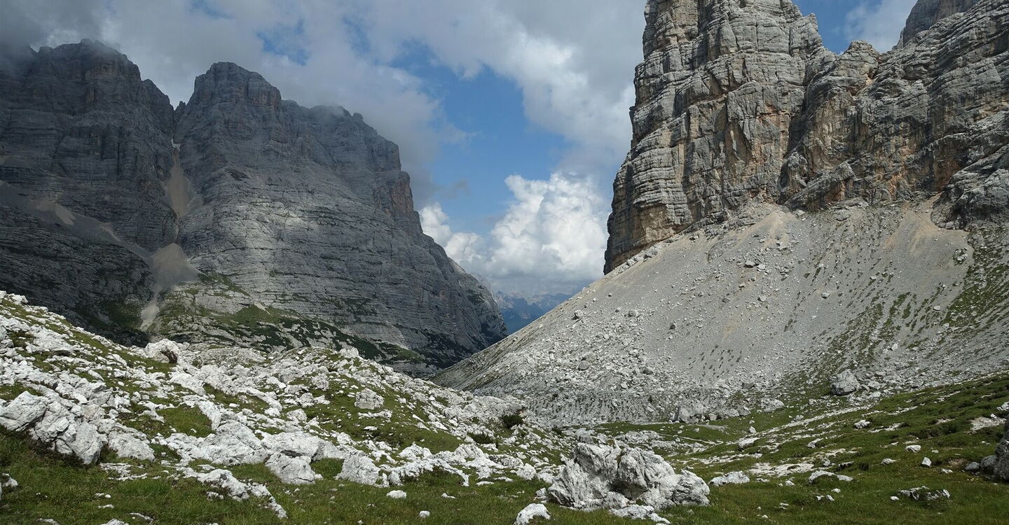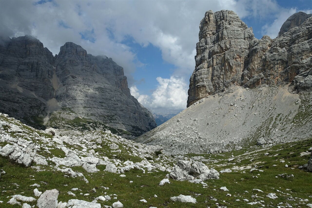 Vom 01 Bivacco Slataper (2.600 m) folgen wir dem bergab führenden Wanderweg 246. Er führt ein kurzes Stück in östlicher Richtung in das riesige Kar zwischen dem 3.002 m hohen Monte della Caccia Grande und dem 3.005 m hohen Punte Tre Sorelle.