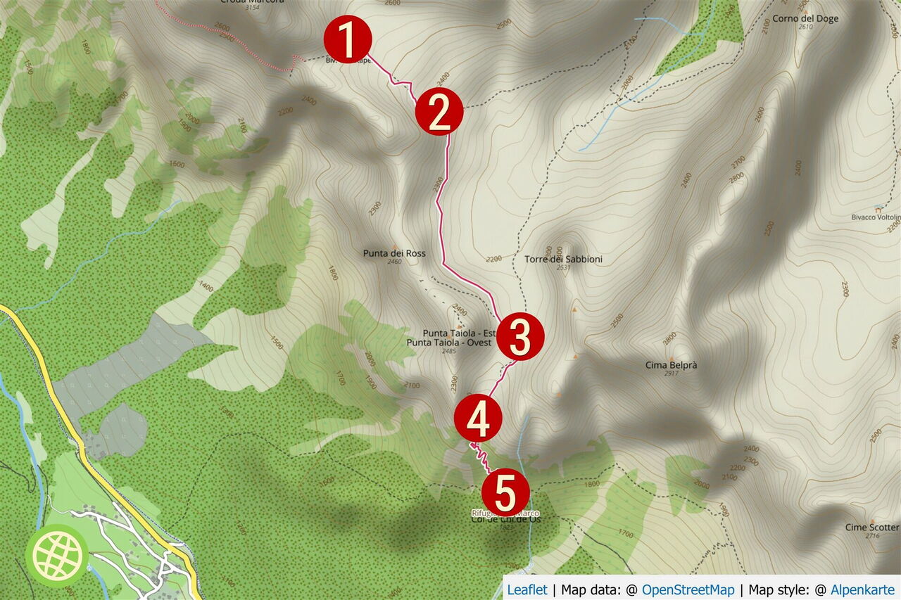 Startpunkt: Das Bivacco Slataper ist nur zu Fuß erreichbar und befindet sich am Ende der Tour 61. Endpunkt: Das Rifugio San Marco ist nur zu Fuß erreichbar und befindet sich am Anfang der Tour 63.