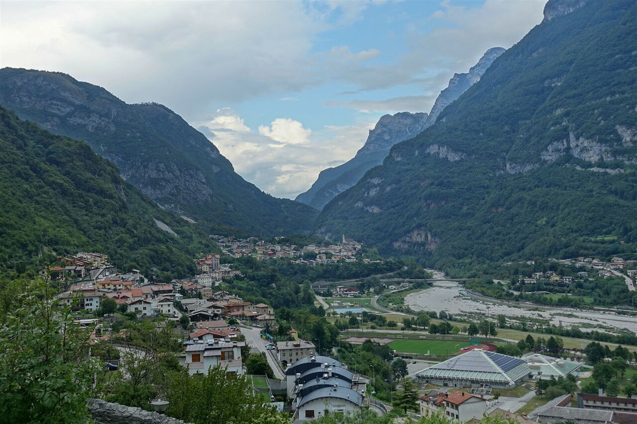 Bei einer kleinen Kapelle gehen wir nicht nach halb links in die Stichstraße, sondern biegen bei der nächsten Möglichkeit scharf rechts ab – hier befindet sich auch ein Wegweiser Richtung Longarone – und gehen nun auf dieser gering befahrenen Straße kontinuierlich bergab. Auf vielen Wegen erreicht man die Bushaltestelle und den 05 Bahnhof von Longarone (444 m).