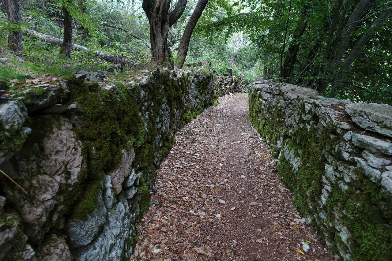 Nachdem wir die steilen und grasbewachsenen Berghänge hinter uns gelassen haben, gelangen wir in den 03 Bosco (Wald) (1.417 m). Im Wechsel zwischen grasbewachsenen Lichtungen und weiteren Waldstücken gehen wir nun kontinuierlich bergab, bis wir dann an einem Kreuz, einer Bank und einem Heiligenschrein vorbeikommen. Ca. 30 m hinter dem Heiligenschrein gehen wir rechts weiter, nun auf einem mit Steinen gesäumten Pfad – weiterhin der Wanderweg 482.