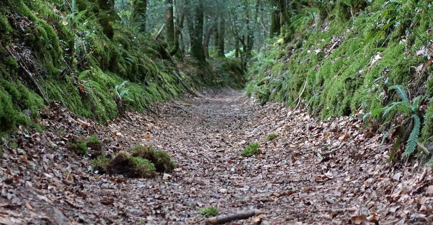 Es folgt ein wunderschöner Hohlweg. Der weitere Verlauf: Wir passieren ein Viehgatter, der Pfad mündet in einen breiteren Weg, auf dem wir weitergehen, wir laufen durch eine Linkskurve und über einen kleinen Bachlauf und an einer Lichtung halten wir uns links. Durch eine Buchenallee gehen wir nun direkt auf die 1550 erbaute 05 Chapelle de Trémalo (62 m) zu. Wir setzen unseren Weg auf der nach Osten weiterführenden Straße fort, um dann bei dem Sackgassenschild und einem auffallenden roten Wasserhydranten rechts abzubiegen. In der darauffolgenden Rechtskurve der Straße – hier befindet sich auch ein Holzgatter – gehen wir links und dann gleich vor der Lichtung rechts, um den nachfolgenden Pfad zu erreichen. Dieser mündet in eine Straße und die Brücke, unter der wir unser Auto geparkt haben.