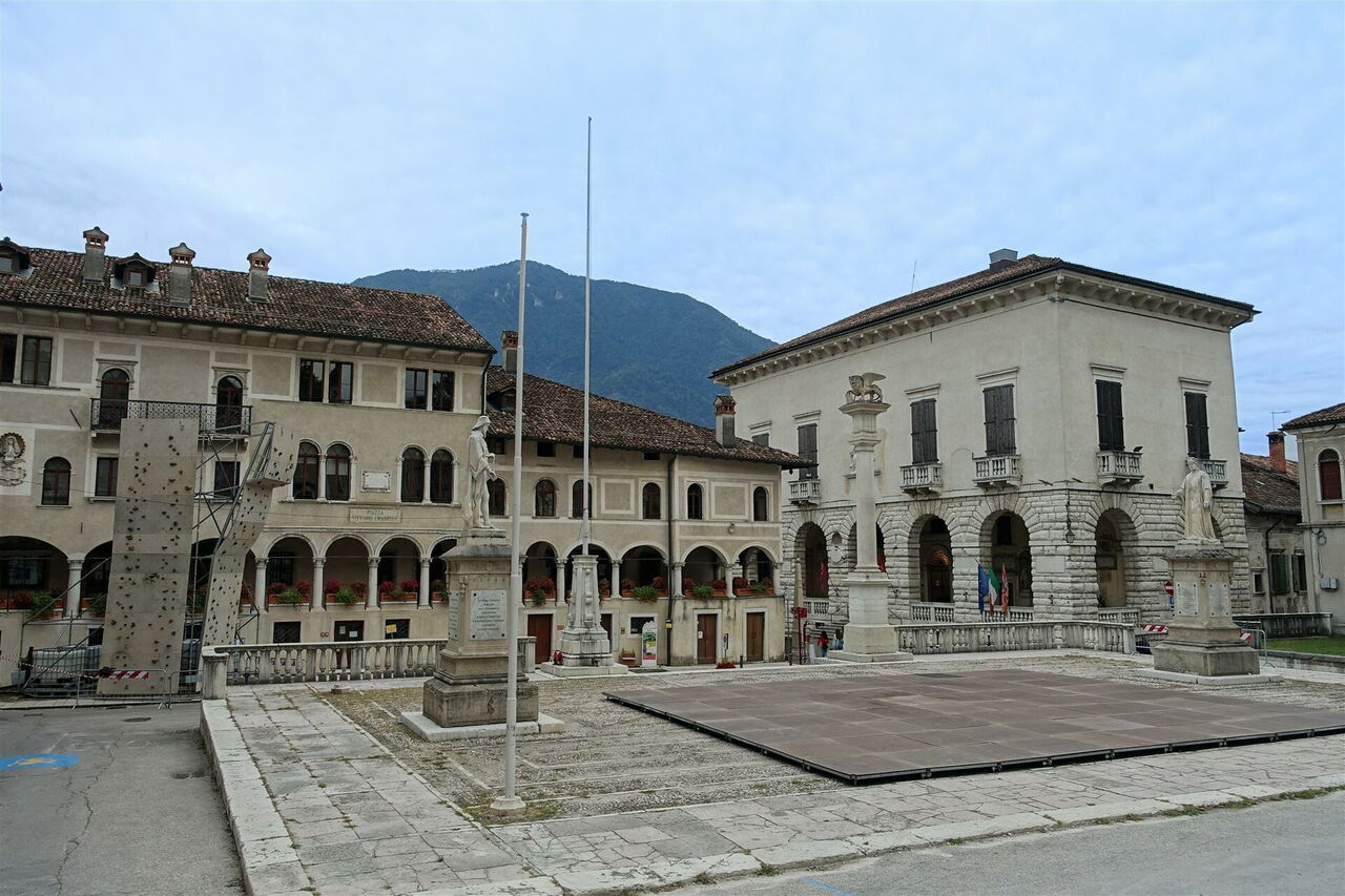 Die nachfolgende Hauptstraße überqueren wir und gelangen so in eine Sackgasse. Dort, wo die Straße eine Rechtskehre macht, gehen wir geradeaus auf der nachfolgenden Piste weiter. Kurz später endet die Piste an einer Straße, die wir nach halb links überqueren, um auf der Via Vespucci weiter Richtung Feltre zu gehen. Die Straße endet vor dem Krankenhaus von Feltre, wo wir links auf der Straße weitergehen. Wir folgen deren Verlauf bis zur Hauptdurchgangsstraße, die wir über den Zebrastreifen überqueren, sodass wir geradeaus in die Einbahnstraße Via Ligot gelangen. Wir passieren zwei Stoppschilder, um dann bei dem dritten Stoppschild rechts in die Via Lorenzo Luzzo abzubiegen. Durch das Porta Oria lassen wir die Schutzmauern aus dem 15. Jahrhundert hinter uns und gelangen im Weiteren zur 04 Piazza Maggiore (266 m).
