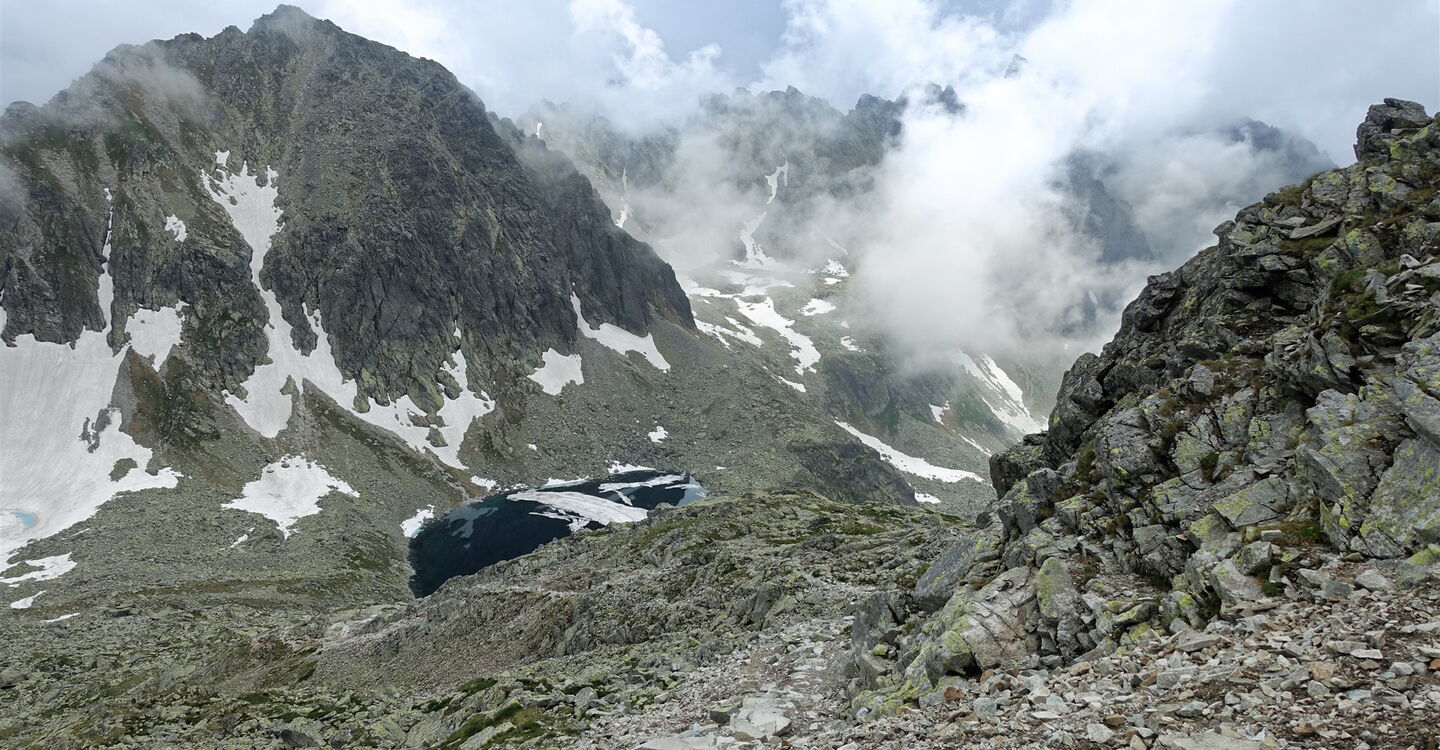 Als sich die Gletscher über das Hochtal wälzten, schliffen sie kantige Felsen und Berge rund, wie wir es auf dem nachfolgenden Aufstieg sehen. Ein Bachbett wird gequert und der Pfad führt an kleinen Seen vorbei. Die nachfolgende Gedenktafel ist den verunglückten Rettungskräften gewidmet, die hier im Juni 1979 mit einem Mi-8-Hubschrauber abstürzten, während sie versuchten, einen deutschen Touristen zu bergen. Die Überreste des Hubschraubers sind nicht weit vom Denkmal entfernt zu sehen. Durch eine steinerne Wüste und hinter einer Felsschwelle erreichen wir den Talschluss mit dem wunderschön gelegenen 02 Capie pleso (2075 m).