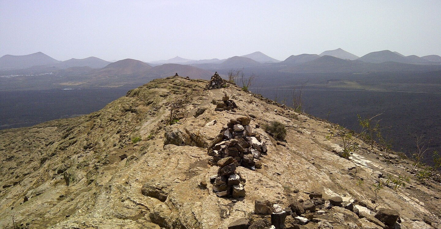 Von hier aus beginnen wir die Rundwanderung auf dem Krater gegen den Uhrzeigersinn. Schnell gewinnen wir an Höhe, bis wir schlussendlich den Gipfel der (03) Caldera Blanca (458 m) erreicht haben. Vom Gipfel aus ergibt sich eine grandiose Aussicht auf die Lavaströme, die es bis zur Nordküste geschafft haben. Richtung Osten erkennen wir den Ort Mancha Blanca und in der Ferne das Risco-de-Famara-Gebirgsmassiv sowie in südlicher und westlicher Richtung die vielen Vulkankegel des Timanfaya-Nationalparks.