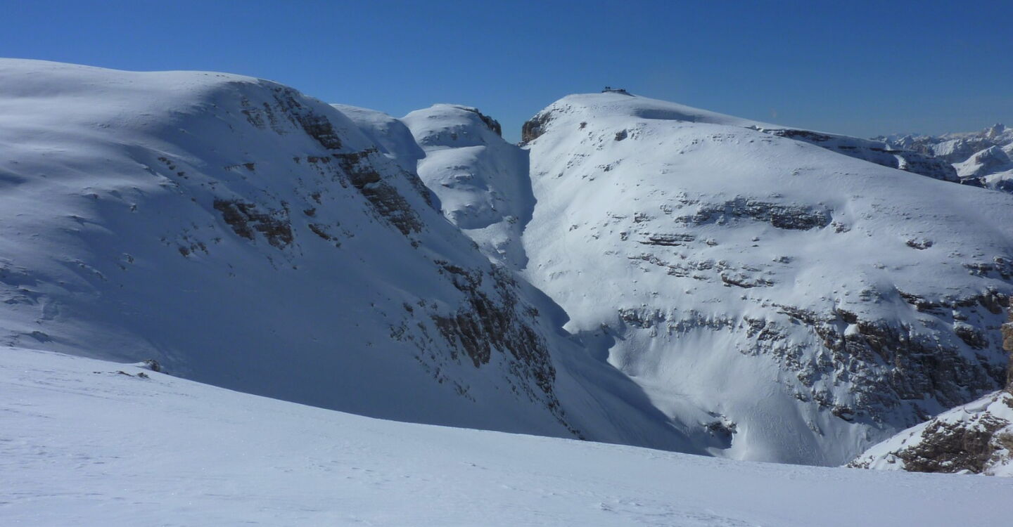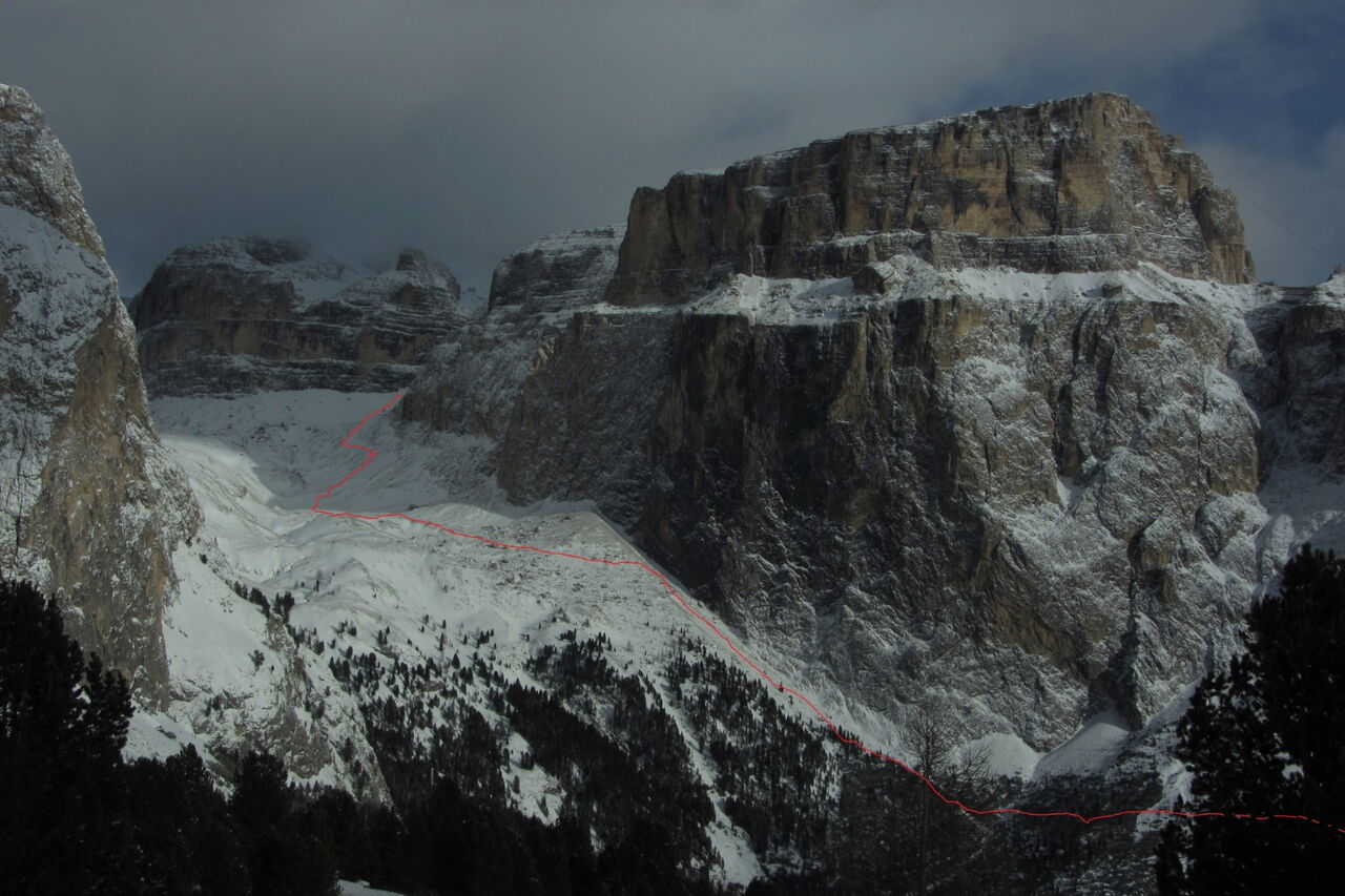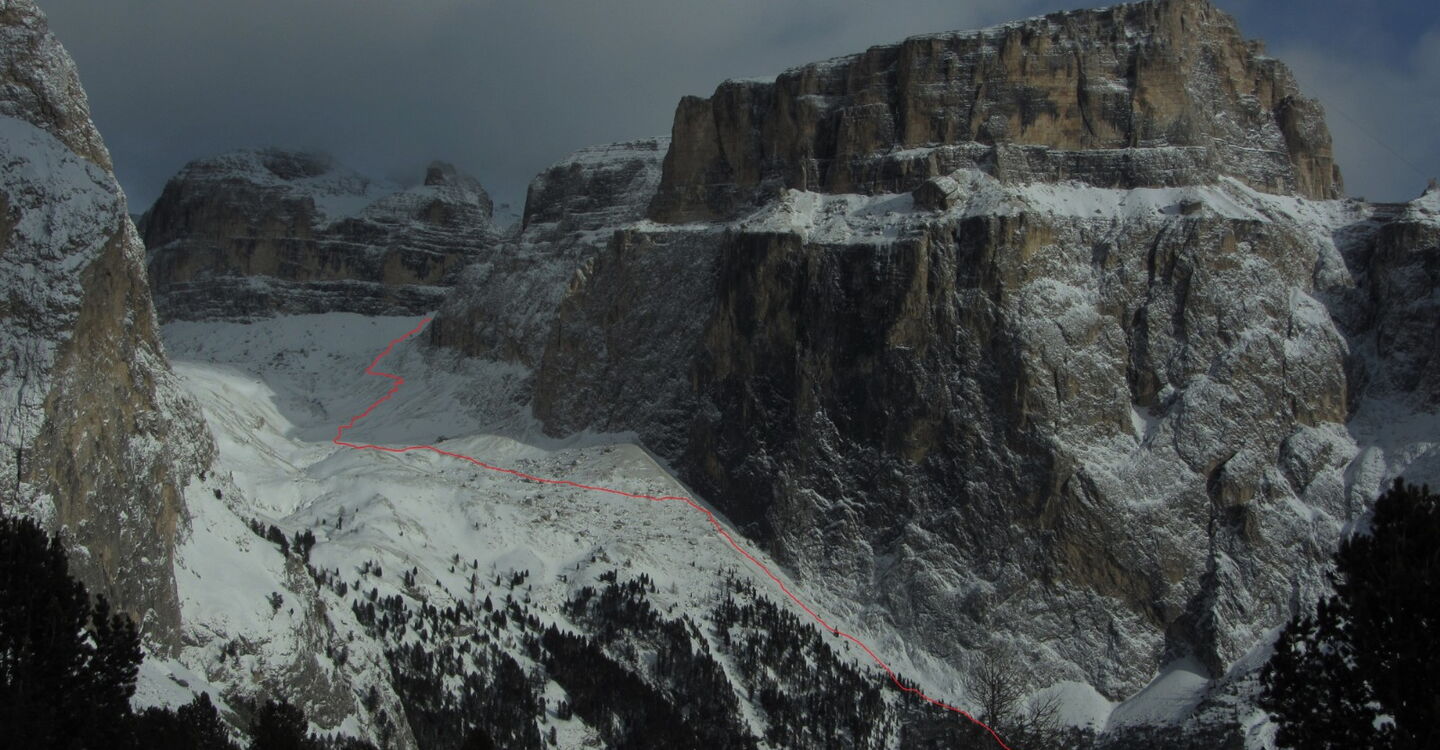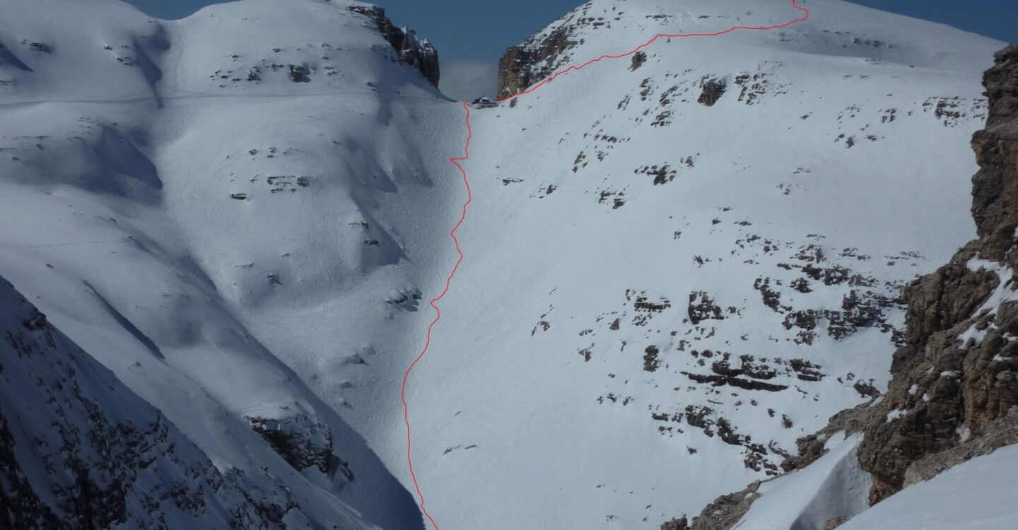 Wenn noch keiner die Strecke gefahren ist, ist die Orientierung ab den Latschenkiefern nicht so einfach. Die Abfahrt führt über einen Nordhang und Westhang. Folgende Ausrüstung wird empfohlen: Produkte für alpine Sicherheit im Schnee, Freerideski und Skitourenhelm. Es empfiehlt sich die Einkehr in das Rifugio Maria bei der Bergstation, welches nach Maria Piaz, der Pionierin des Tourismus am Pordoipass, benannt wurde. Beste Jahreszeit: Januar bis April. Uns erwarten kurze Stücke mit bis zu 35° Hangneigung.