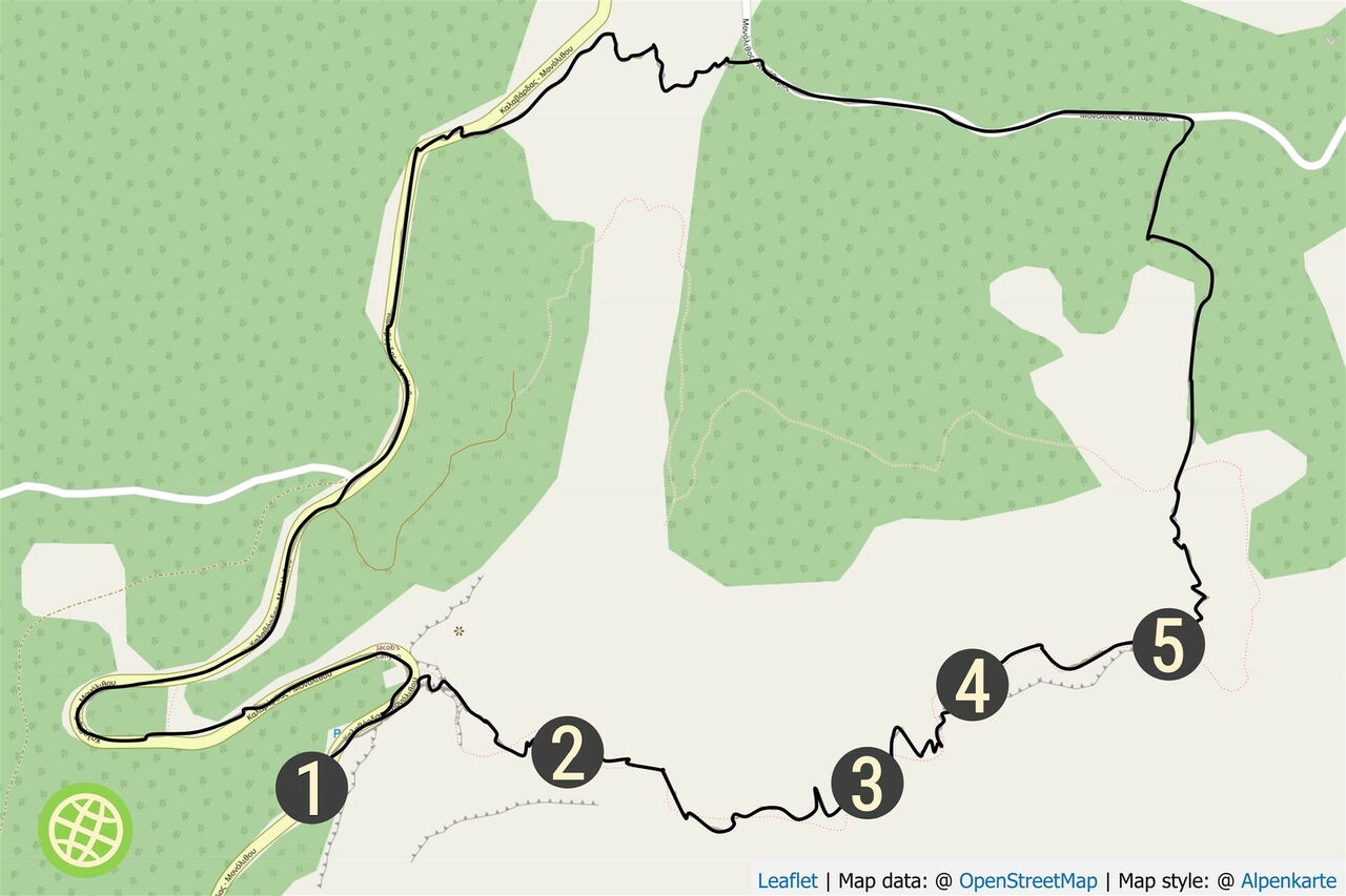 Vom (01) Start und Ziel (365 m) laufen wir auf der Asphaltstraße Richtung Kritina bis in die Linkskurve und steigen, hier rechts hinter der Leitplanke, in die Schlucht hinein. Es folgt der erste Höhepunkt, die Schlucht verengt sich und wir steigen über stufenförmig geschichtete Gesteinsschichten und erreichen eine erste Gumpe.
