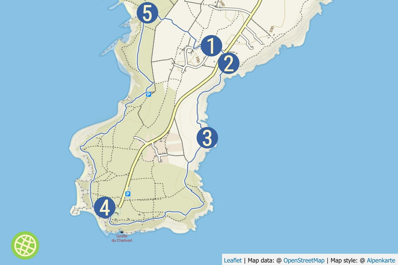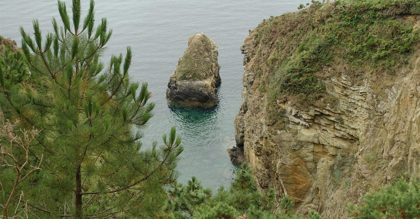 Entlang von Überresten einer Steinmauer gehen wir direkt auf eine Landzunge zu. Links zweigt ein Pfad zu dieser ab, unterhalb versteckt liegt der 05 l'anse de Porz Créguen (75 m). Nach weiteren 50 m – hier bilden zwei Steinmauern eine Ecke – gehen wir rechts. Nach 200 m gehen wir an der breiten Piste links und bei der nächsten Möglichkeit sofort rechts. Einen rechten und einen linken Abzweiger ignorieren wir und gehen geradeaus weiter. An der Weggabelung, wo Steine ohne Bewuchs den Weg säumen, gehen wir halb links. Bei der nächsten Weggabelung – hier gehen wir auf Bäume zu – halten wir uns halb rechts und gehen in Richtung eines Hauses. An der Straße angekommen, befindet sich auf der linken Seite der Ausgangspunkt.