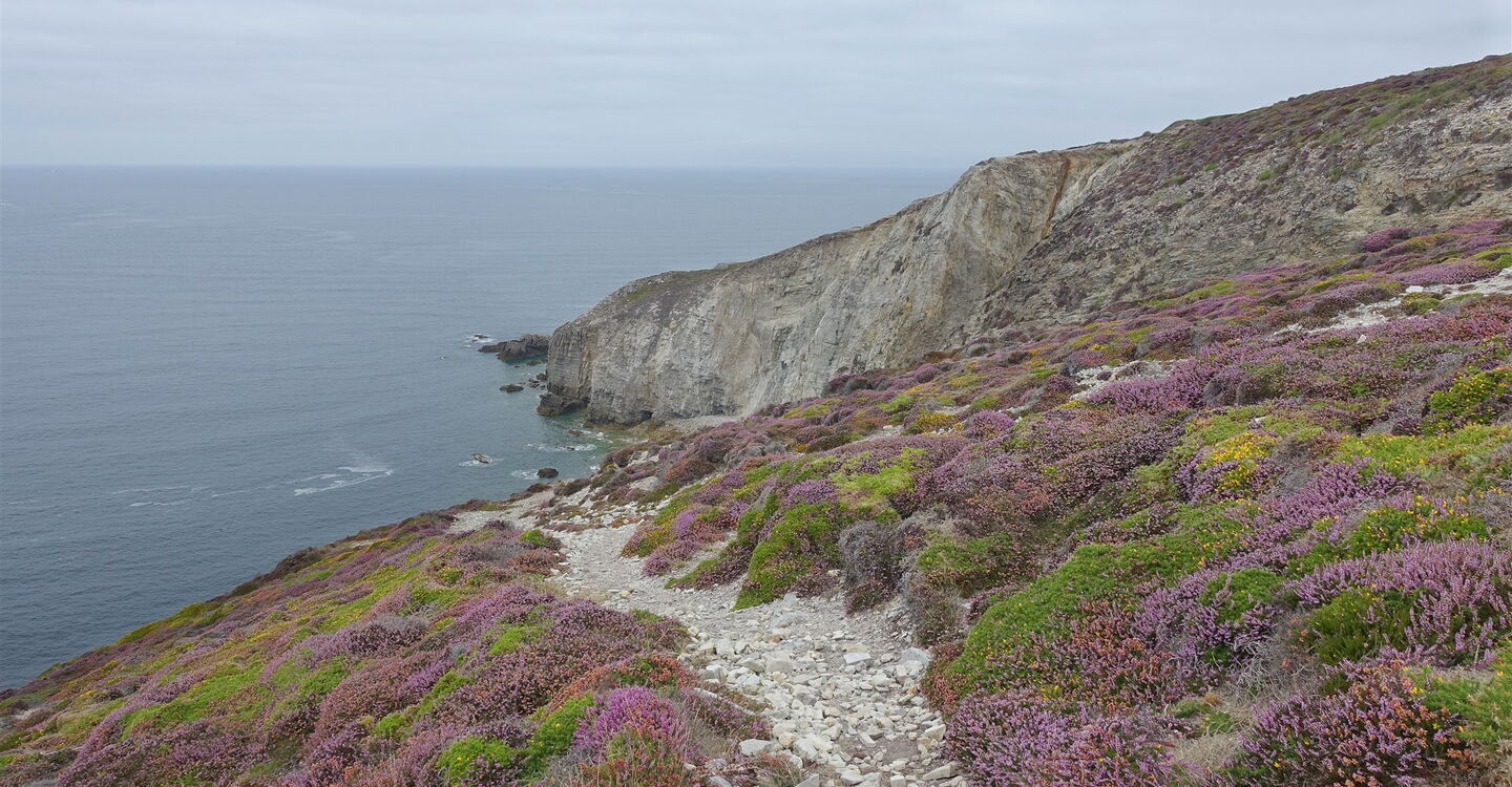 Auf einer spektakulären Streckenführung erkunden wir das Cap de la Chèvre, eine Landzunge am südlichen Ende der Halbinsel Crozon. Die Landschaft wechselt zwischen bis zu 100 m hohen Klippen, lichten Kiefernwäldern und blühenden Heideflächen, die von Ginster unterbrochen werden. Durch die sich ständig verändernden Wassertiefen und den wechselnden Meeresuntergrund aus Sand, Kieselsteinen und Fels ergeben sich besondere Farbnuancen im Atlantischen Ozean. Man spürt förmlich die Nähe des Golfstroms, in geschützten Buchten findet man eine mediterran anmutende Flora. Es ergeben sich wunderbare Ausblicke über die Baie de Douarnenez bis zur gegenüberliegenden Landzunge Sizun. Bunker als stumme Zeitzeugen der Kriegsgeschichte sowie ein beeindruckendes Denkmal für die Flieger der französischen Marine lassen uns innehalten. Ein Weg der Langsamkeit.