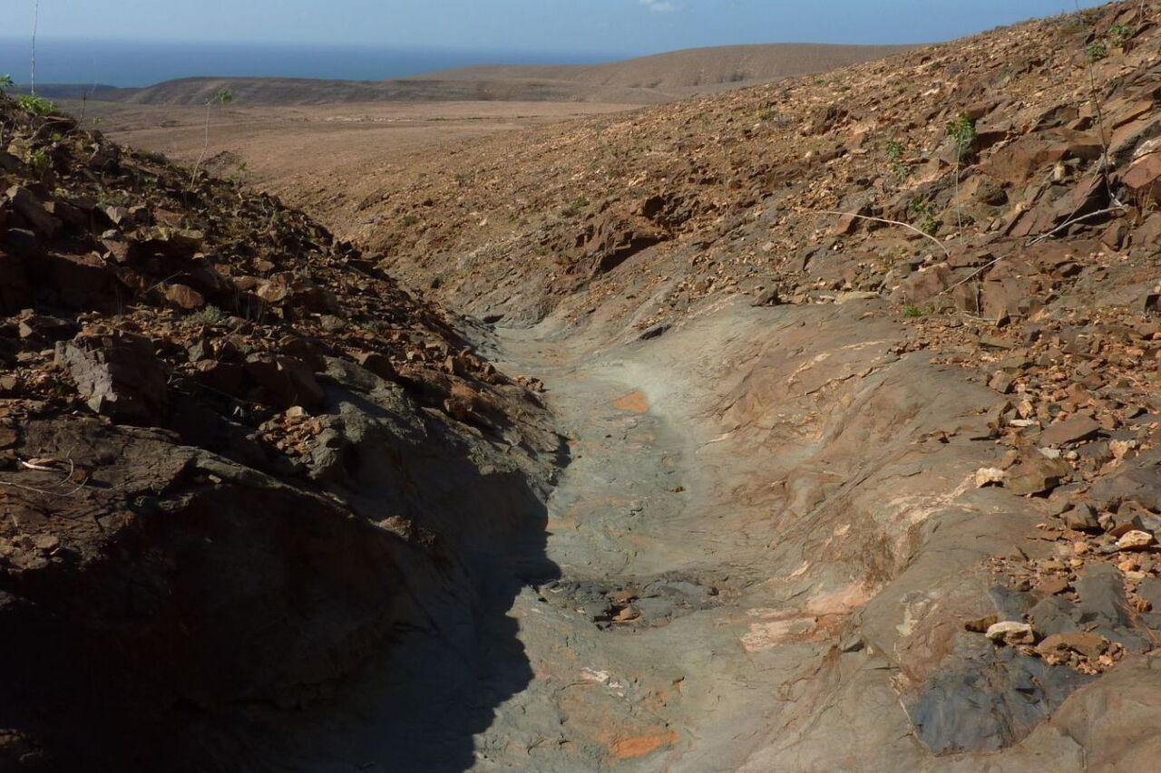 Halb rechts in westliche Richtung, parallel zu dem Ziegenzaun und der Steinmauer, steigen wir auf dem vor uns liegenden Bergrücken ab. Wir kommen an einem kleinen Wald von Wolfsmilchgewächsen vorbei, ehe sich die Grundstückbegrenzungsmauer nach rechts vom Drahtzaun entfernt. Nach einer längeren Geraden entlang des Ziegenzauns sehen wir ca. 50 m Entfernung, wie der Zaun eine Linkskehre macht. Hier halten wir Ausschau nach einem Steinmännchen, das links vom Zaun steht. An dieser Stelle kann man die Befestigungsstange des Zauns herausziehen und diesen ohne Probleme übersteigen. Wir beginnen jetzt Richtung halb rechts den rechts von uns liegenden Hügel zu queren. Dabei verlieren wir leicht an Höhe, bis wir nach ca. 180 m ein durch Erosion ausgewaschenes Flussbett erreichen. Hier befindet sich der (03) Einstieg in das Barranco (222 m). Während das erste Stück noch sehr steil ist, wird der nachfolgende Weg sichtlich flacher. Schlussendlich erreichen wir einen weiteren Ziegenzaun, den es zu überwinden gilt.