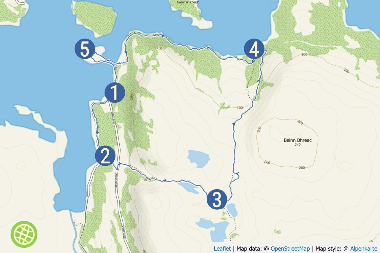Diese besondere Wanderung führt auf dem ersten und letzten Wegabschnitt entlang der Küsten des Loch Moidart, wo es die Möglichkeit gibt, Küstenvögel, Steinadler oder Otter zu beobachten – oder einfach nur die fantastischen Ausblicke auf die vorgelagerte Inselwelt zu genießen. Auf dem mittleren Wegabschnitt wandern wir durch Eichen- und Nadelwälder, vorbei an zwei Seen und einer faszinierenden Moor- und Heidelandschaft. Nur bei Ebbe gelangt man zur Burgruine des Castle Tioram, mystisch gelegen auf einer Gezeiteninsel kurz vor dem Atlantik und zwischen vielen bewaldeten Inseln.