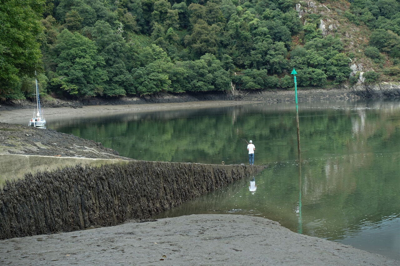 Aufgrund der windgeschützten Lage in diesem Flusstal konnte der ursprüngliche Wald mit seinen Baumriesen bestehen. Einmal mündet der Weg in die Straße, aber nach wenigen Metern biegen wir wieder rechts auf einen Pfad ab und erreichen den 03 Port de la Roche-Jagu (4 m). Hier an den Ufern des Flusses Trieux befindet sich ein kleiner Anleger für Ausflugsboote. Direkt oberhalb des Anlegers verlässt ein schmaler Pfad die Bucht und man gelangt auf einen breiteren Weg, dem wir nun oberhalb des Flusslaufes folgen.