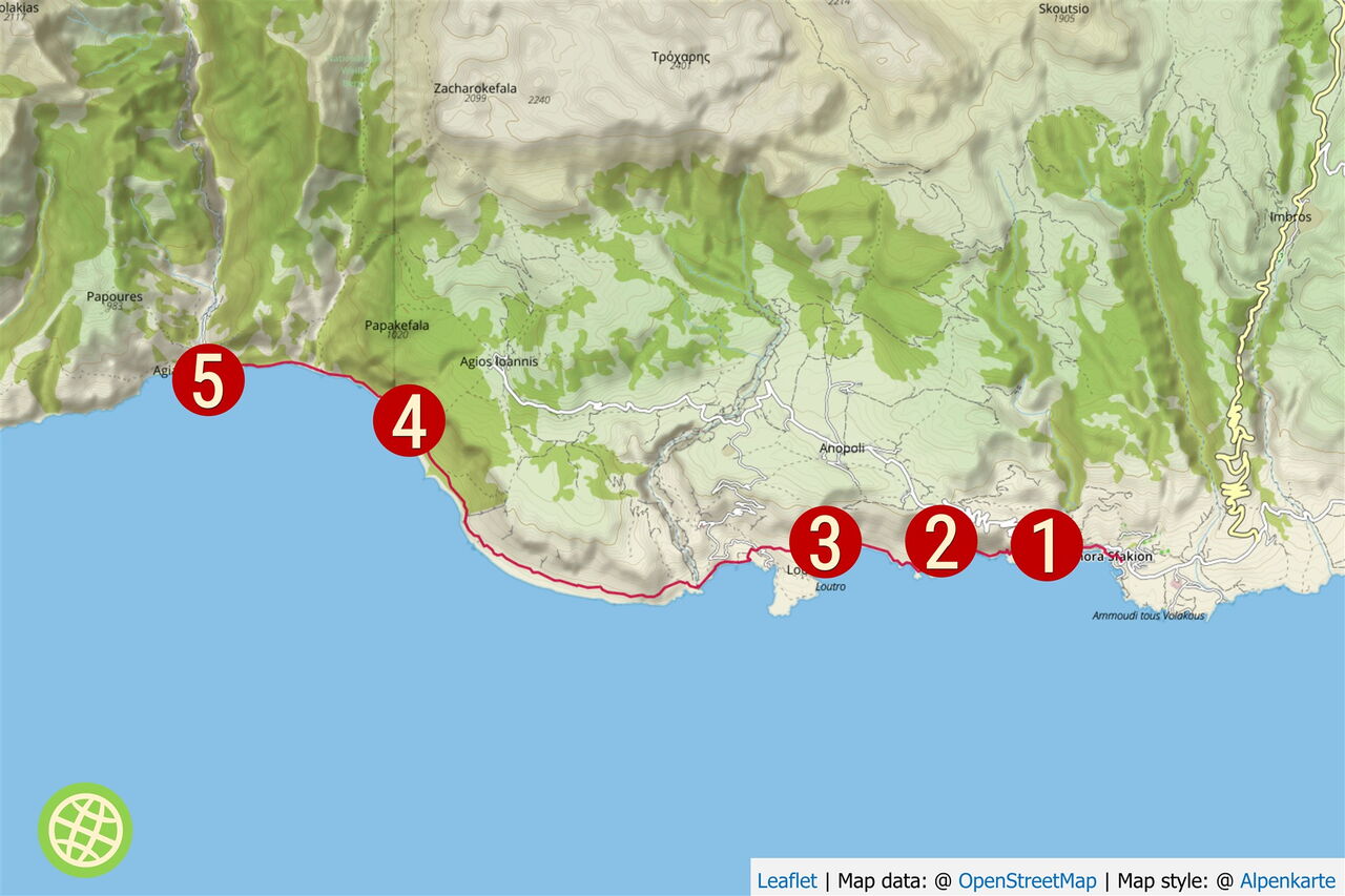 Charakter: Eine mittelschwere Wanderung auf gut ausgebauten Pfaden und Wegen. Art des Weges: 5 % Asphaltstraße, 10 % Schotterpiste und 85 % Pfad. Zusatzausrüstung: viel Trinkwasser, da es auf diesem Wegabschnitt sehr heiß werden kann. Einkehr: Snacks and Sweetwater Beach, Tavernen in Loudro, Lykos und bei der Marmara-Bucht. Beste Wanderzeit: ganzjährig. Hinweis: Camping am Strand von Agia Roumeli ist erlaubt.