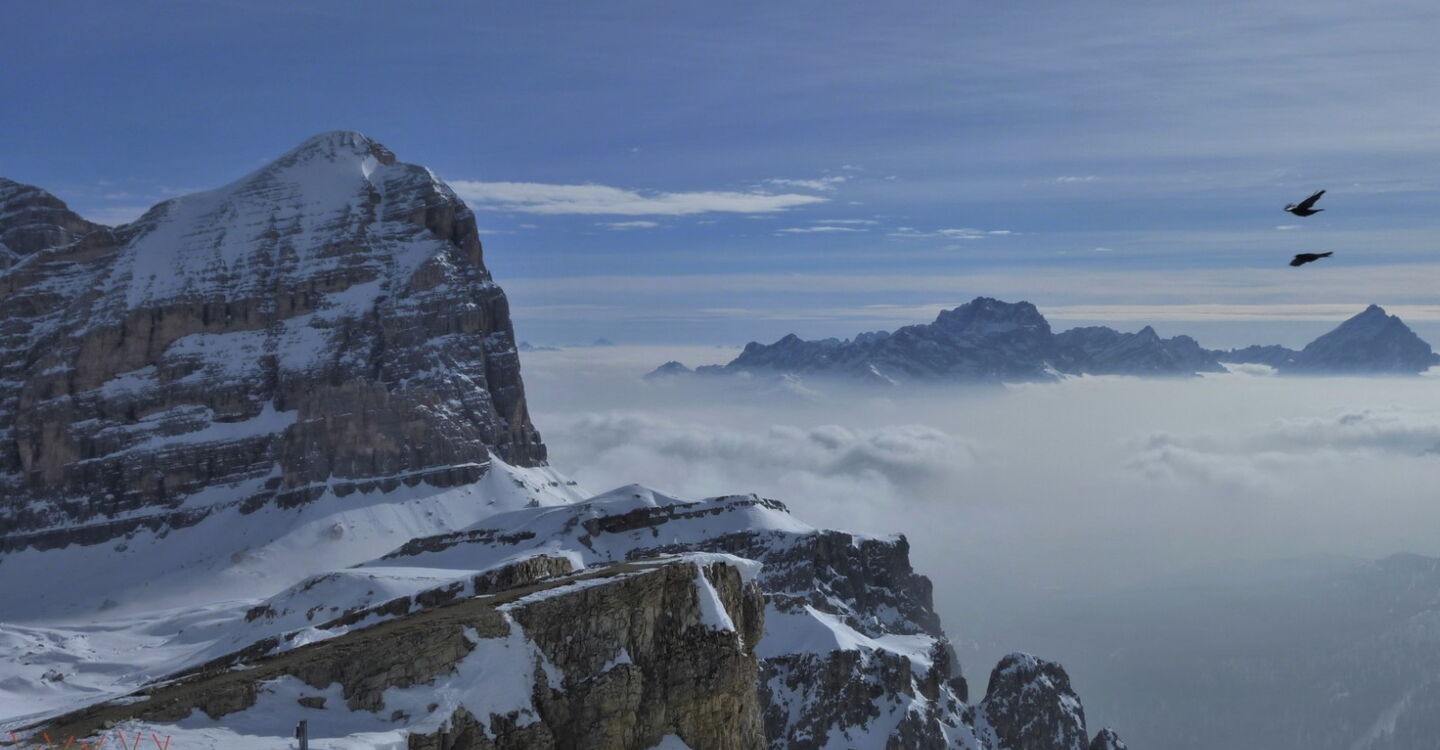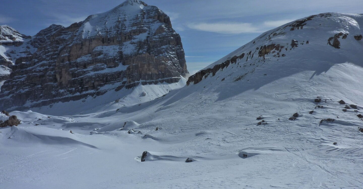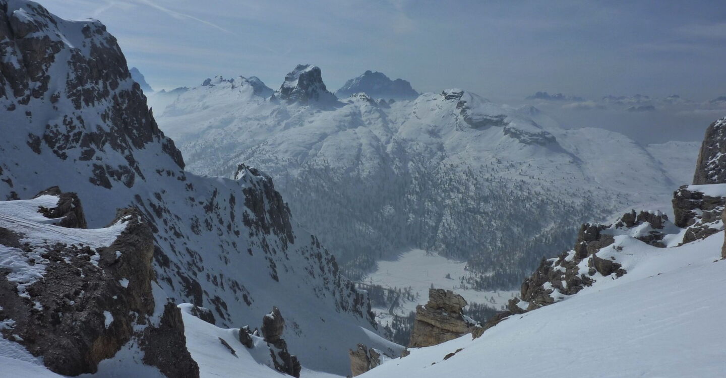 Der 1956 durch die Olympischen Winterspiele bekannt gewordene Ort Cortina d'Ampezzo liegt in traumhafter Landschaft, umgeben von den Gipfeln der Tofana di Mezzo 3243 m, Monte Cristallo 3218 m und Punta Sorapis 3205 m. Bisher gehört die Dolomitengemeinde zur venetischen Provinz Belluno und nicht zu Südtirol, trotzdem wird auch hier Ladinsch gesprochen. Ohne Frage in Cortina d'Ampezzo trifft man Gäste aus der ganzen Welt und besonders auf der Flaniermeile im Dorfkern. Die drei Skigebiete Faloria Cristallo Mietres, Tofan Ra Valles und Lagazuoi 4 Torri, mit 38 Bergbahnen und 120 Pistenkilometer, sind absolute Spitzenklasse. Wir sind aber gekommen um die Variantenabfahrten in dieser Region zu erkunden.