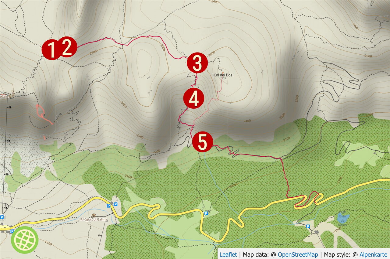 Vom Falzaregopass fahren wir zur Bergstation der Seilbahn Nr. 1 Falzarego Lagazuoi. Hier nehmen wir die Talabfahrt. In der zweiten Rechtskehre verlassen wir die Piste und fahren geradeaus weiter.