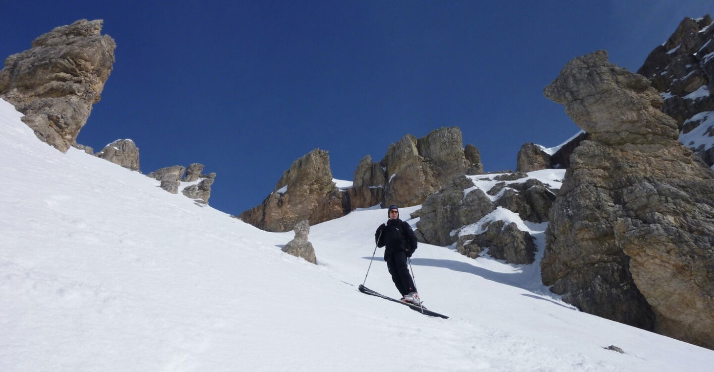 Vor uns liegt eine hervorragende Variantenabfahrt zwischen den Spitzen der Lagzuoi Torries, die bei Firnschnee, wie an unserem Tag, ein großartiges Erlebnis ist. Am unteren Ende treffen wir auf eine Forststraße.