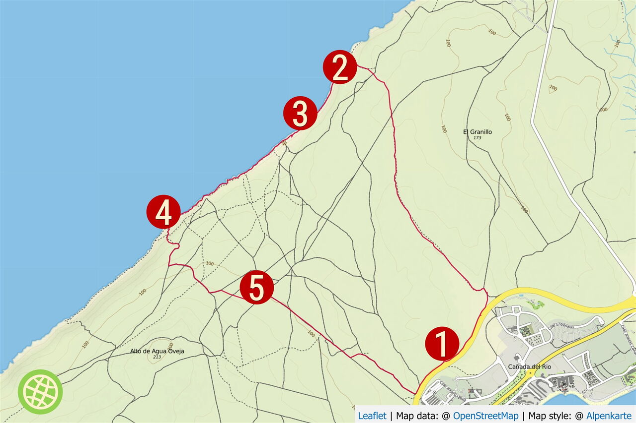 Vom (01) Start und Ziel (37 m) gehen wir in nordöstlicher Richtung auf der Schotterpiste neben der Autobahn, bis wir auf einen Fußgängertunnel unter der Autobahn treffen. Nach weiteren 100 m zweigt halb links ein Pfad ab. Bei der nächsten Möglichkeit gehen wir an der Weggabelung links. Nachdem wir die beiden Steine passiert haben, gehen wir scharf links. Durch eine Rechtskurve gelangen wir auf eine Schotterpiste, die ins Landesinnere führt, immer parallel zu dem links von uns liegenden Barranco. In der Ferne sind bereits zwei große Steinpyramiden auszumachen. Wir gehen an diesen vorbei und befinden uns nun oberhalb einer links von uns liegenden Schlucht. Von nun an markieren Steinmännchen den Weg. Nach 400 m queren wir eine Sandpiste. Der Weg ist nun schwerer auszumachen, aber wir bleiben auf der bereits eingeschlagenen Marschrichtung.