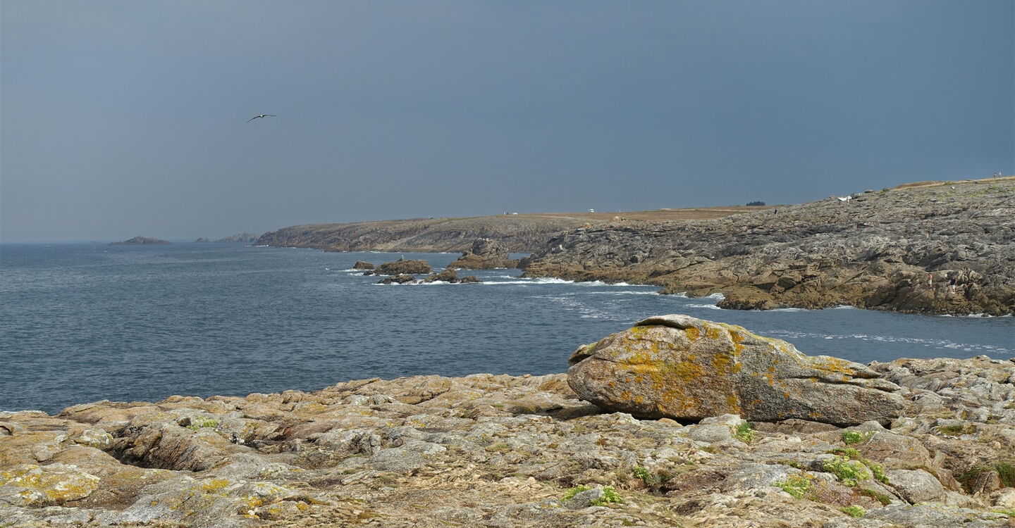 Die Promenade endet und wir gehen nun auf einem ausgewiesenen Wanderweg, bis wir den ersten atemberaubenden Aussichtspunkt erreichen, das 02 Kap Beg er Goalennec (8 m) – man schaut fast endlos in nördliche Richtung entlang der zerklüfteten Küste. Hinter einer kleinen Hütte am Parkplatz beginnt der weiterführende Pfad. Auf einem Holzbohlenweg passieren wir eine nicht besonders schöne Sandbucht. Kurz später endet der Pfad, wir gehen links und gelangen so wieder auf einen Pfad. Bei einem großen Stein erreichen wir den Aussichtspunkt Grote de Kerniscop und kurz später die erste schöne Sandbucht, den Port Guibello.