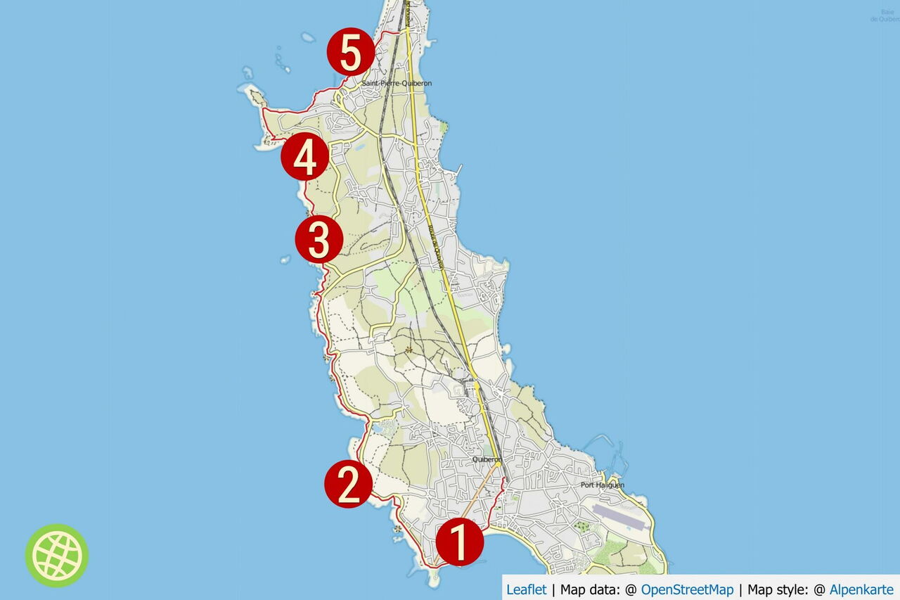 Mittlerer Schwierigkeitsgrad, Orientierung problemlos auch ohne Karte möglich. Art des Weges: 20 % Straße und 80 % Pfad. Zusatzausrüstung: Keine. Einkehr: Am Start der Wanderung in Quiberon bei km 0,88, im Panorama-Restaurant Kap Beg er Goalennec bei km 3,5 und an der Hafenmole in Portivy bei km 11,7. Beste Wanderzeit: Ganzjährig. Sehenswert Region: Das 17 km entfernte Carnac, weltweit berühmt für seine mehr als 3000 Menhire, Geokoordinaten 47.591800 -3.085476.