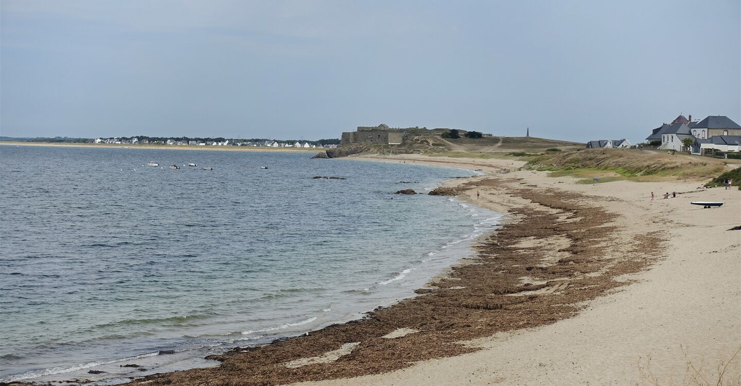 Nachdem wir einem weiteren Parkplatz hinter uns gelassen haben, führt der Pfad zwischen dem Atlantik und Villen entlang, in der Ferne sieht man die Festungsmauern des 05 Fort de Penthiévre (12 m). Sobald der Weg über eine Treppe führt, gehen wir die wenigen Meter rechts bis zur Avenue de Groix vor und dann bei der Straßengabelung rechts in die Rue de Sombreuil, diese führt direkt zur Bahnstation Kerhostin.