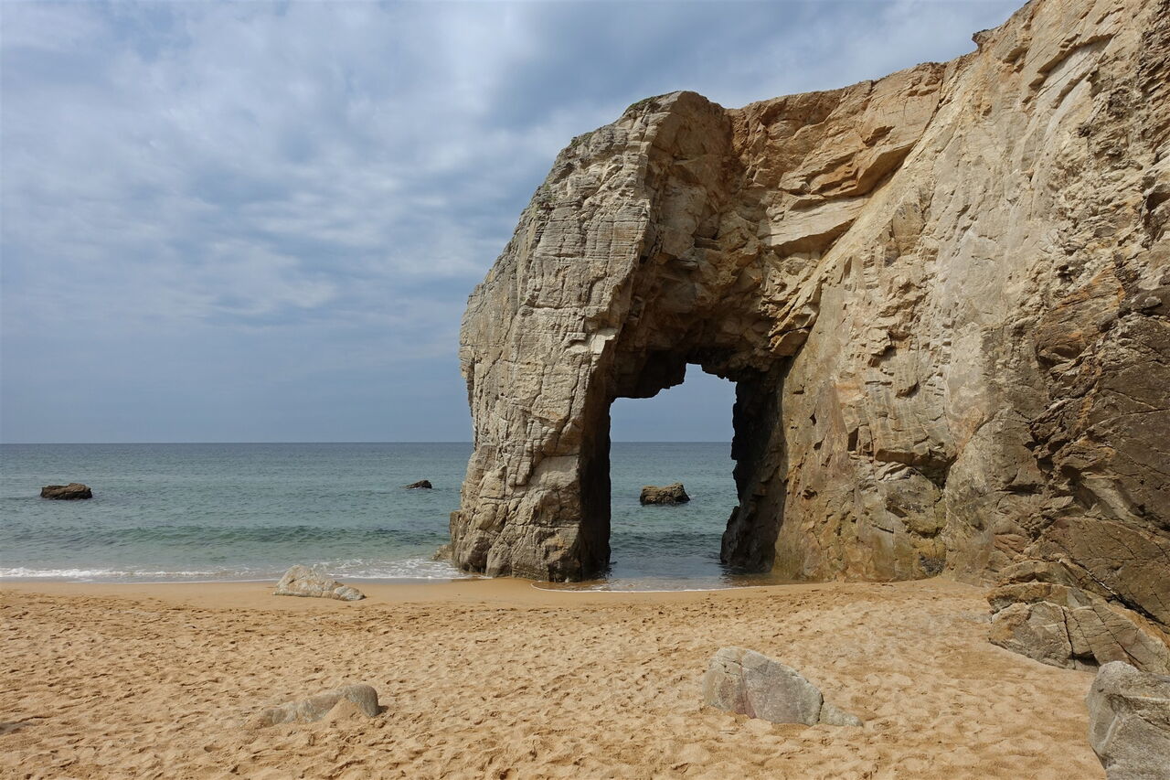 Einer der Höhepunkte der Wanderung ist dann das 04 Felstor am Port Blanc (12 m). Den darauffolgenden Abzweiger zur Pointe du Percho lassen wir aus – natürlich nur wer möchte. Kurz vor der Landzunge queren wir nach rechts und gehen nun in östliche Richtung – an der nördlichen Spitze der Landzunge. Kurz vor einem Parkplatz gehen wir halb links und nun wieder direkt an der Küste entlang. Hinter einer lang gezogenen Hafenmauer in dem Dorf Portivy kommen wir an zwei weiteren Restaurants vorbei.