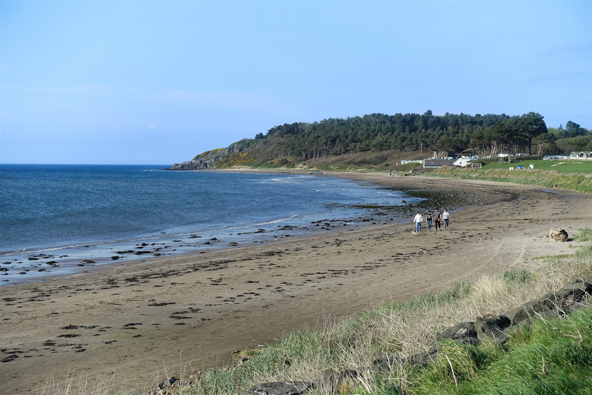 Die Erkundungsrunde beginnt beim 01 Beach car park (2 m) am nördlichen Ende des kleinen Dorfes Maidens. Von dort aus geht es herunter an den Strand und anschließend rechts in nördliche Richtung. Je nach Stand der Tide kann man direkt am Strand gehen oder auf dem Fußweg oberhalb der Küstenbefestigung. 300 m hinter einem kleinen Bachlauf, der in das Meer fließt, verlassen wir den Strandabschnitt über Holztreppen und gelangen in den Wald oberhalb der Klippen. Dort angekommen gehen wir links, bei der nächsten Weggabelung erneut links und bei der darauffolgenden Weggabelung rechts. Im Mai blüht der Ginster farbenfroh und unter den Bäumen befindet sich ein Meer aus blauen, rundblättrigen Glockenblumen.