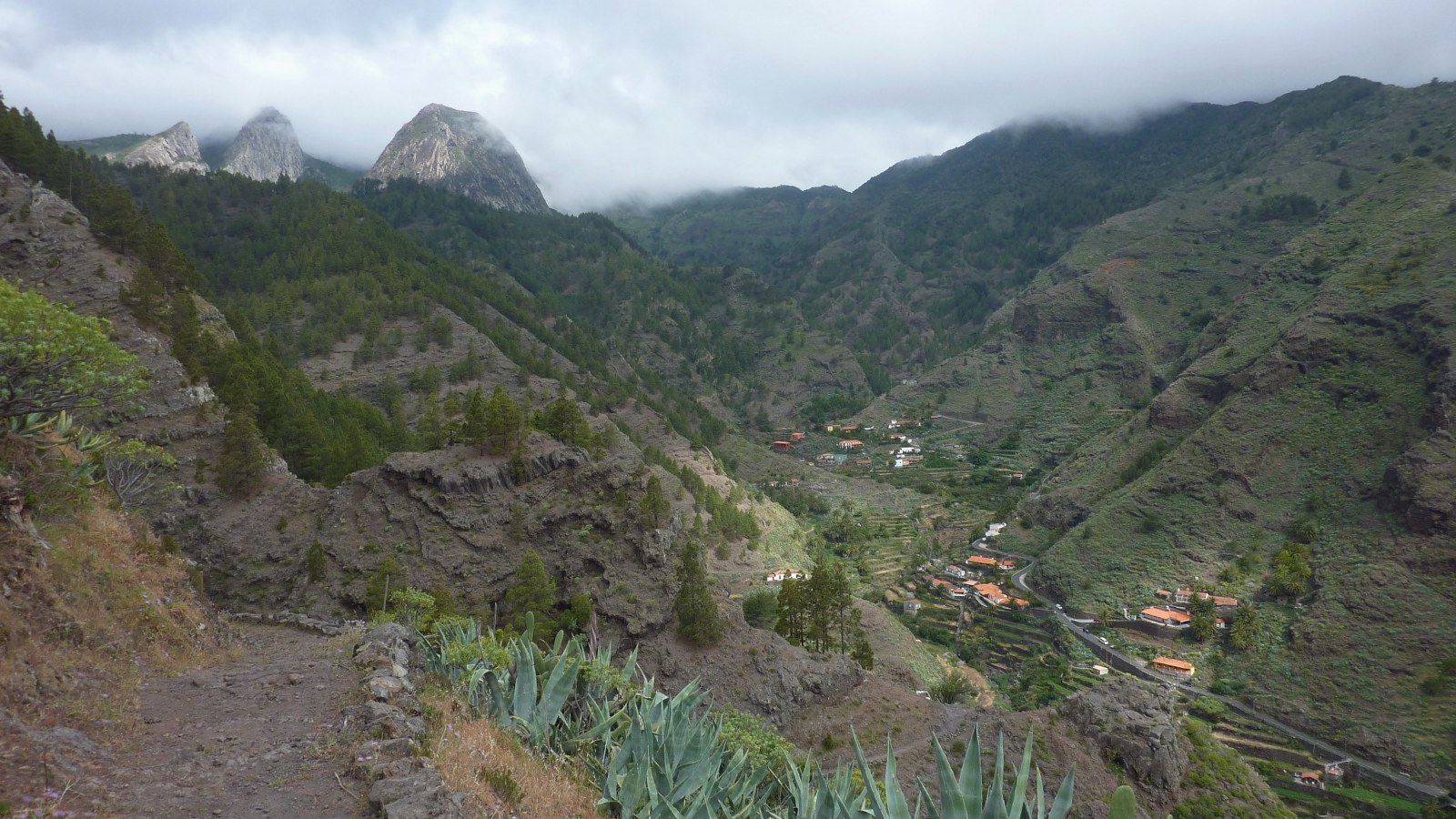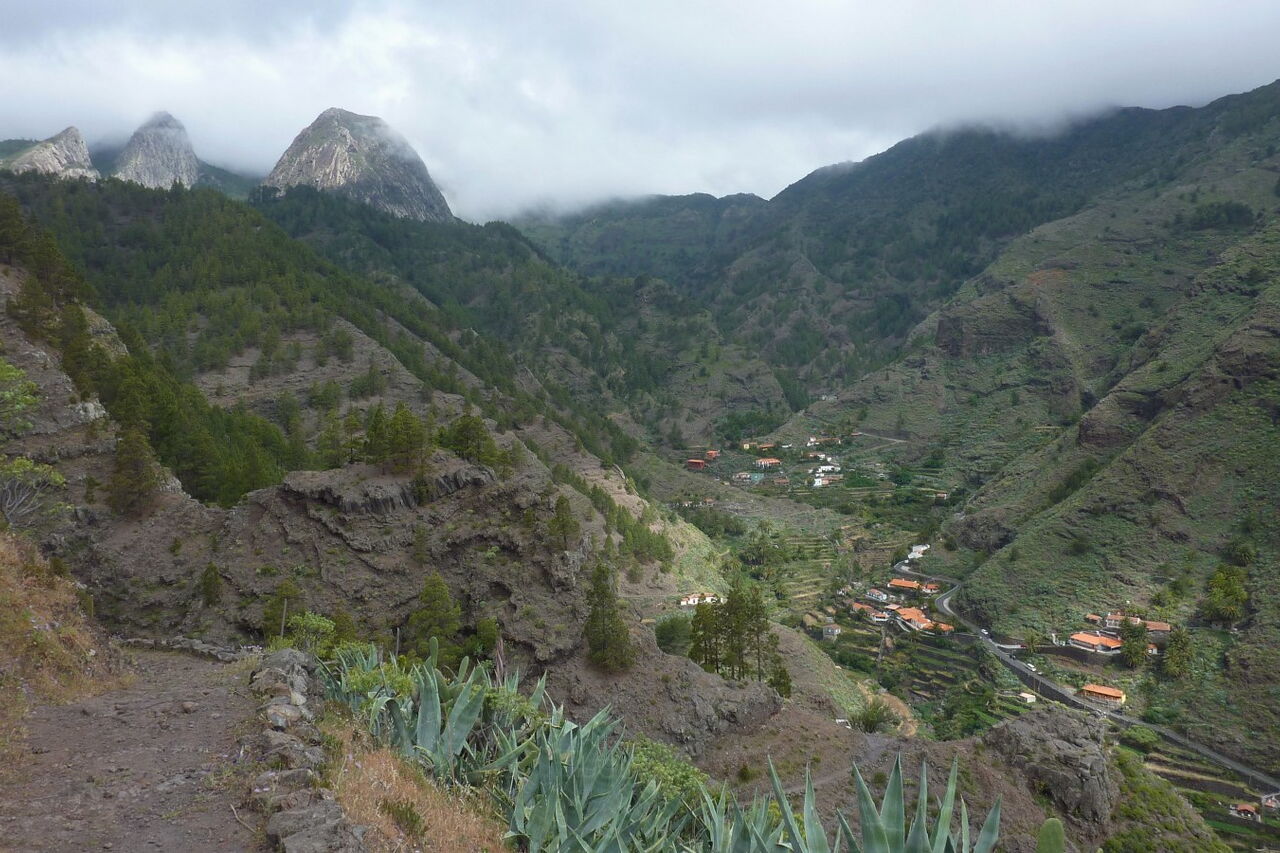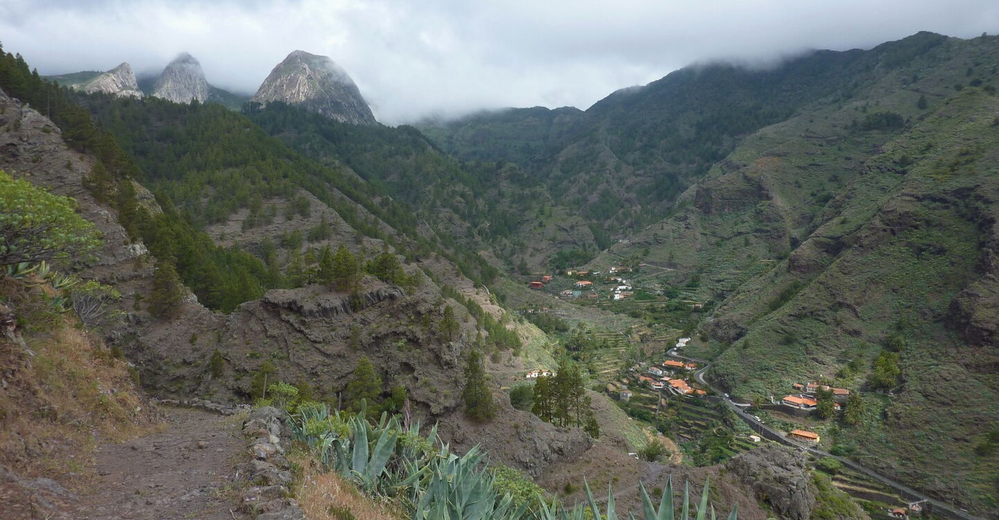 Die Hauptstadt San Sebastián de La Gomera wurde nach der spanischen Eroberung im Jahr 1440 von Hernán Peraza in Besitz genommen. Nach ihm wurde die (01) Degollada de Peraza (962 m), der Ausgangspunkt unserer heutigen Wanderung, benannt. Bei guter Sicht kann man in der Ferne Teneriffa und den Teide ausmachen. Rechts vom Mirador führt ein breit gepflasterter Weg hinab in das Barranco de Las Lajas. Bei der ersten Weggabelung halten wir uns links Richtung La Laja. Recht bald sehen wir unter uns das idyllische Bergdorf La Laja und halb links lässt sich schon einmal die Familie der Roques erblicken; mit Ausnahme des Roque de Agando, auf den die Sicht noch versperrt ist.