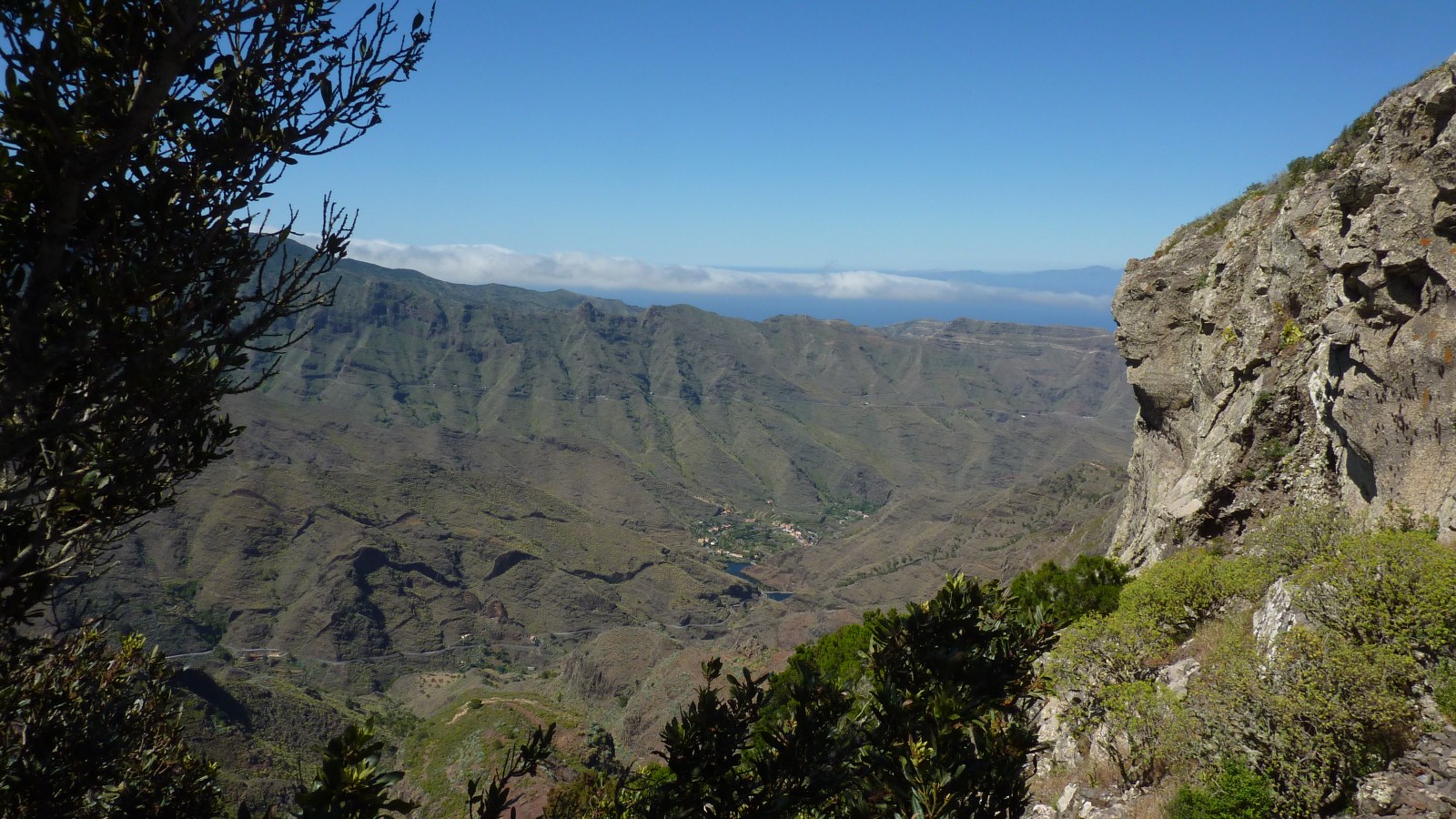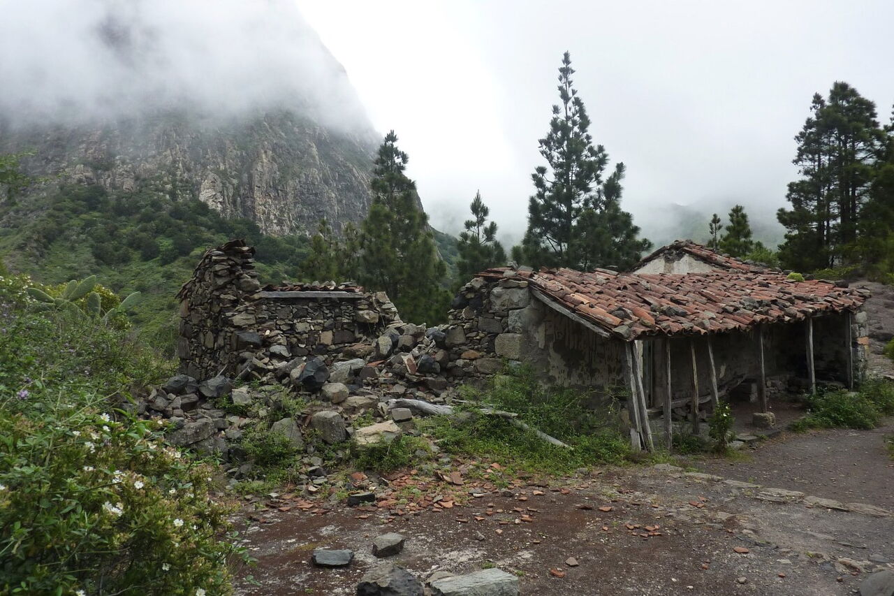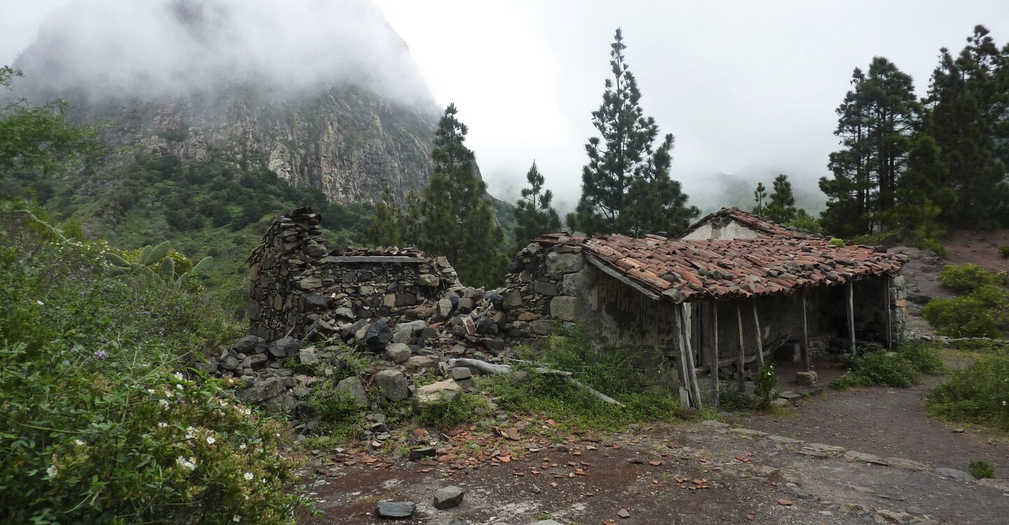 Die Hauptstadt San Sebastián de La Gomera wurde nach der spanischen Eroberung im Jahr 1440 von Hernán Peraza in Besitz genommen. Nach ihm wurde die (01) Degollada de Peraza (962 m), der Ausgangspunkt unserer heutigen Wanderung, benannt. Bei guter Sicht kann man in der Ferne Teneriffa und den Teide ausmachen. Rechts vom Mirador führt ein breit gepflasterter Weg hinab in das Barranco de Las Lajas. Bei der ersten Weggabelung halten wir uns links Richtung La Laja. Recht bald sehen wir unter uns das idyllische Bergdorf La Laja und halb links lässt sich schon einmal die Familie der Roques erblicken; mit Ausnahme des Roque de Agando, auf den die Sicht noch versperrt ist.