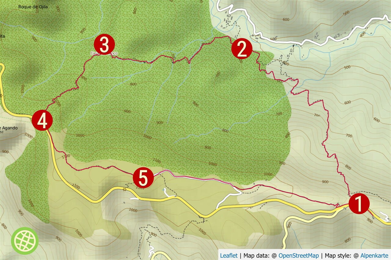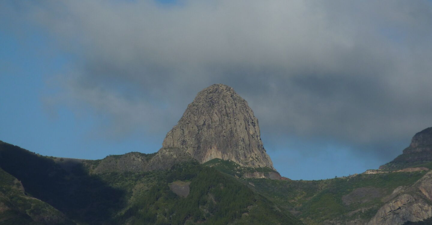 Auf dem weiterführenden Weg lassen wir die Casa rechts von uns liegen und steigen weiter auf, bis sich vor uns die (04) Ostwand des Roque de Agando (1080 m) erhebt, eines der Wahrzeichen von La Gomera. Seine kleineren Geschwister sind der Roque de la Zarcita (1223 m), der Roque de Las Lajas (1139 m) und der massive Roque de Ojlla (1171 m). Weiterhin über einen perfekt gepflasterten Camino erreichen wir die Höhenstraße GM-2, an der wir links gehen, über einen kleinen Damm, um dann halb links, etwas erhöht, dem beginnenden Pfad zu folgen.