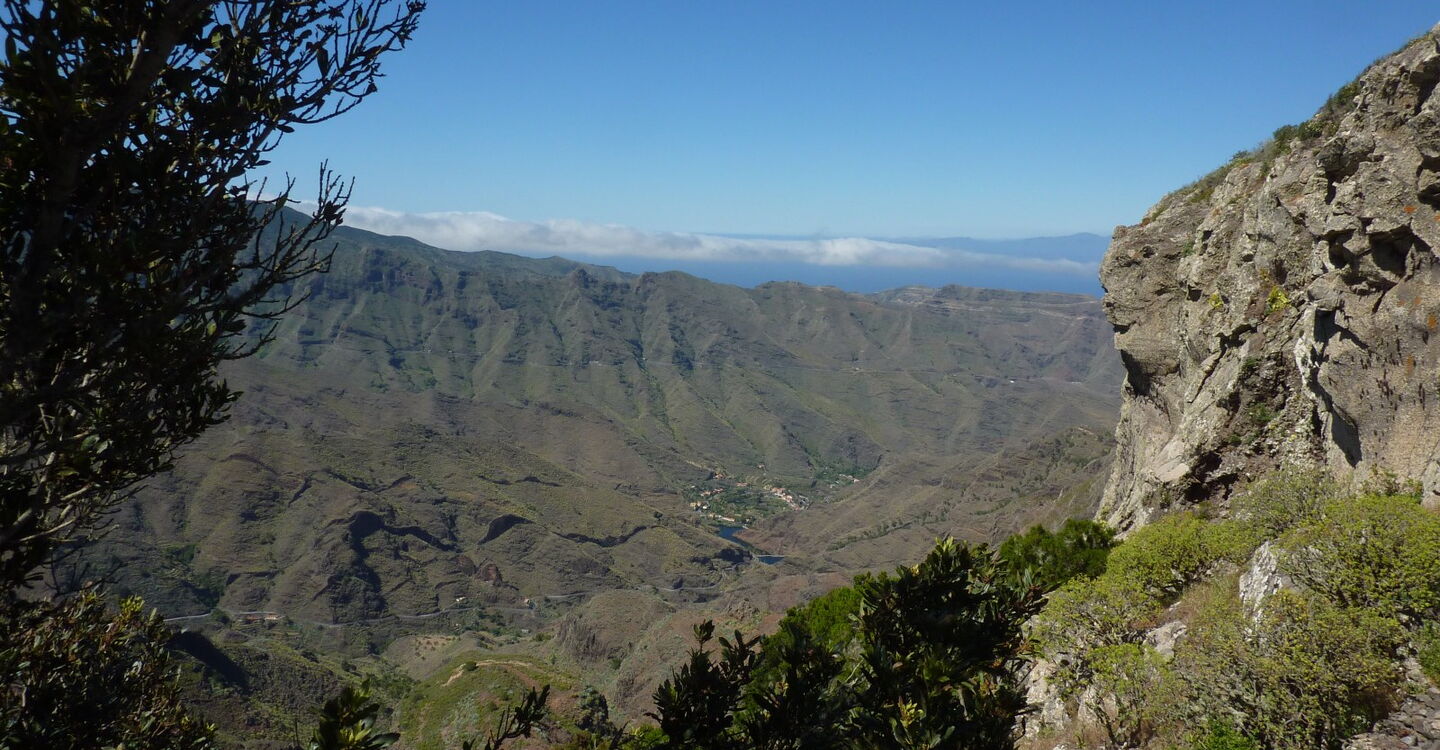 Der Abstieg nach La Laja und der Aufstieg zum Roque de Agando verlaufen durch ein windgeschütztes Tal mit einem schattenspendenden Kiefernwald. Es ergeben sich immer wieder atemberaubende Blicke auf die Familie der Roquea. Unterhalb des Roque de Agando treffen wir dagegen an 80 % aller Tage auf komplett andere Wetterbedingungen. Hier spüren wir die ganze Kraft der stark wehenden Passatwinde. Das folgende Teilstück der Wanderung durch das zentrale Hochgebirge verläuft auf der Grenze zwischen dem feuchten Norden und dem trockenen Süden. An Tagen mit guter Sicht lässt sich der Unterschied hautnah erleben. Gegensätzlicher kann Wetter auf solch engem Raum nicht sein - einfach beeindruckend.