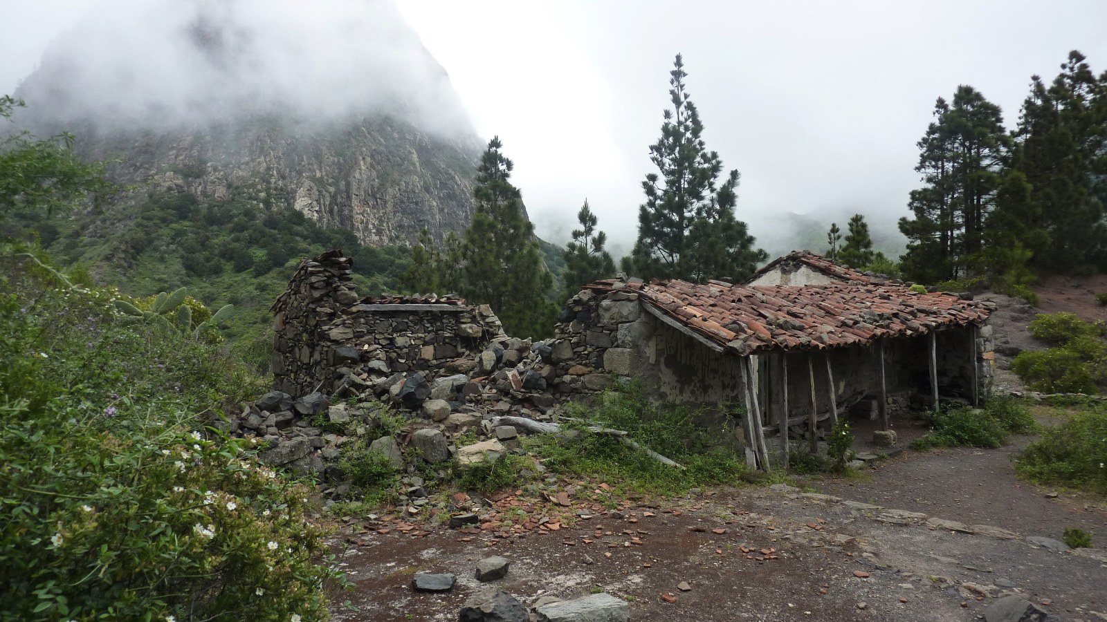 Ein steil ansteigender, mit Steinen gepflasterter Pfad führt durch einen lichten Kiefernwald mit einem feinen Nadelteppich sowie vereinzelt abgestorbenen Eukalyptusbäumen. Am oberen Waldrand erreichen wir die verfallene (03) Casa del Manco (864 m).