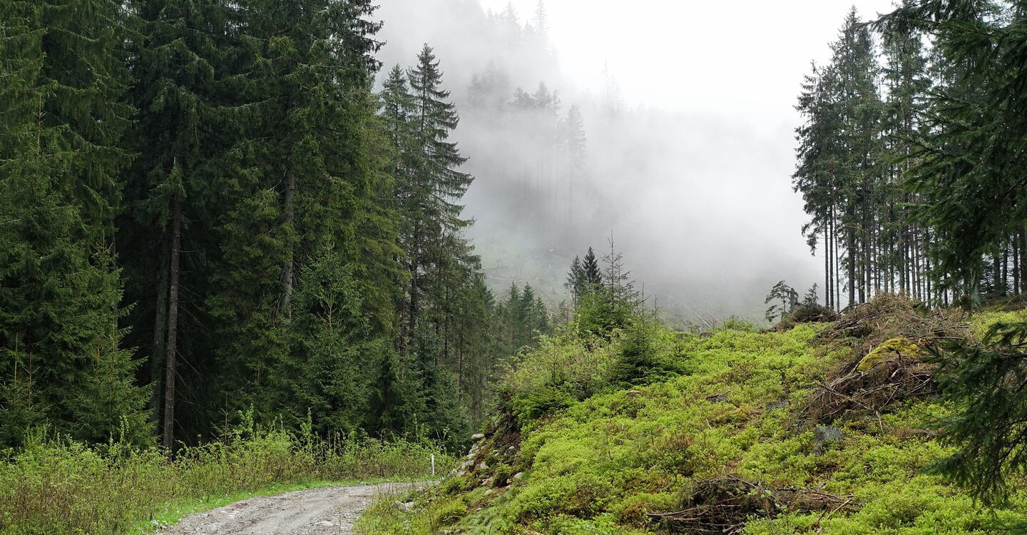 50 m bevor die Piste nach halb links den Bachlauf queren würde, zweigen wir abermals halb rechts ab. Auch hier befinden sich grüne Markierungen. Wir erreichen die Informationstafel mit der Nummer 10. Der nachfolgende Aufstieg führt durch einen ursprünglichen und intakten Wald. Wir erreichen die Informationstafel mit der Nummer 9. Unser Weg endet am 02 Záver Širokej doliny (1416 m) und wir gehen nicht geradeaus weiter, sondern rechts auf dem rot markierten und mit Felsen verlegten Pfad. Wir überqueren zwei Bachbetten und erreichen die Informationstafel mit der Nummer 8 sowie die Schneise einer Skipiste. Diese überqueren wir, um am rechten Pistenrand bei roten Wegweisern den Aufstieg fortzusetzen.