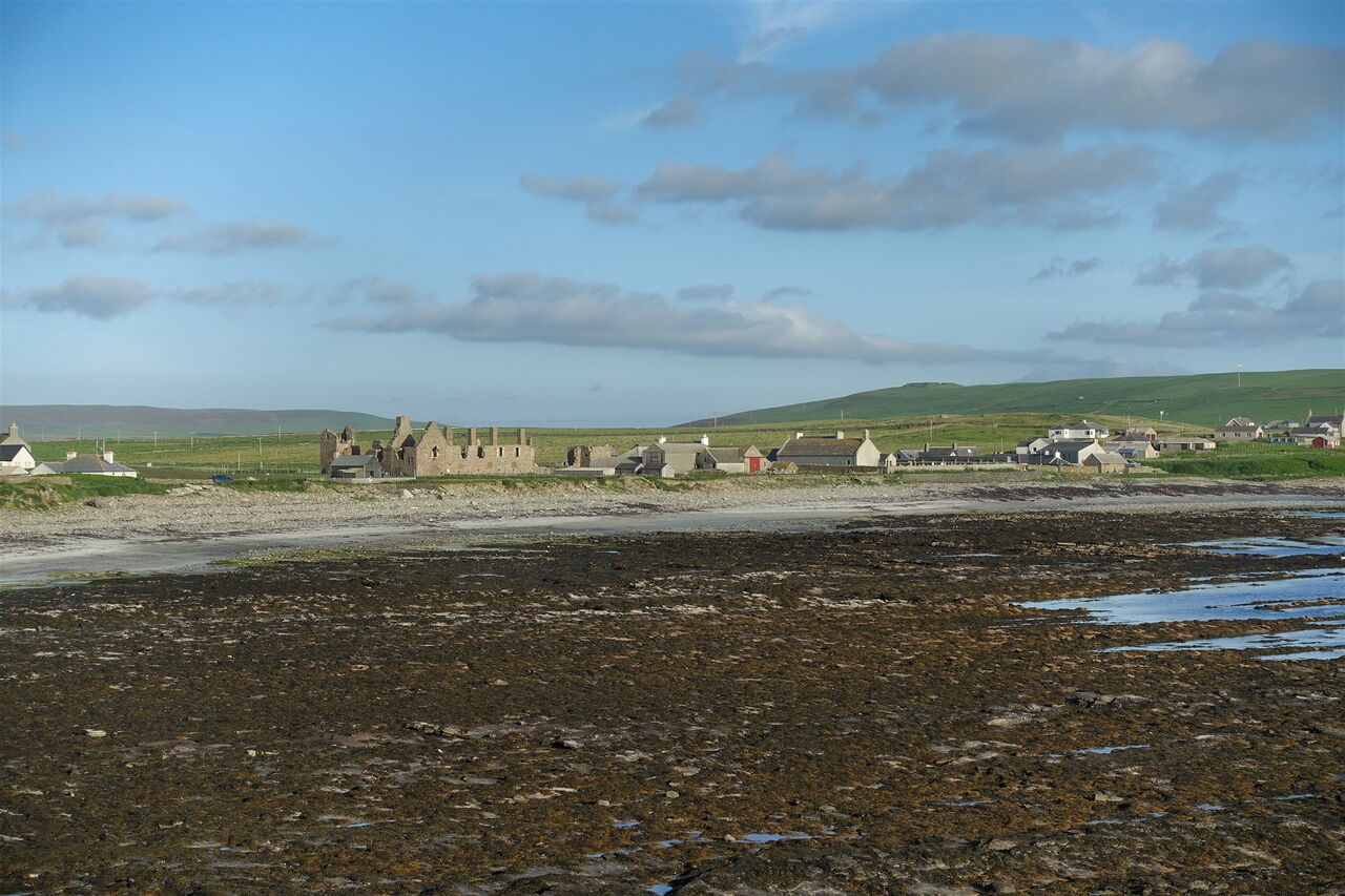 Nach 600 m erreichen wir die gering befahrene Anfahrtsstraße und folgen dieser rechts herunter zum 05 Earl's Palace (Birsay) (12 m). Ein verbauter Stein zeigt die Jahreszahl 1574. Das Gebäude diente als Ersatz für den Earl's Palace in Kirkwall und ein Jahrhundert später nutzten es die Earls of Morton. Seit dem 17. Jahrhundert ist das Bauwerk nicht mehr bewohnt und somit dem Verfall preisgegeben.