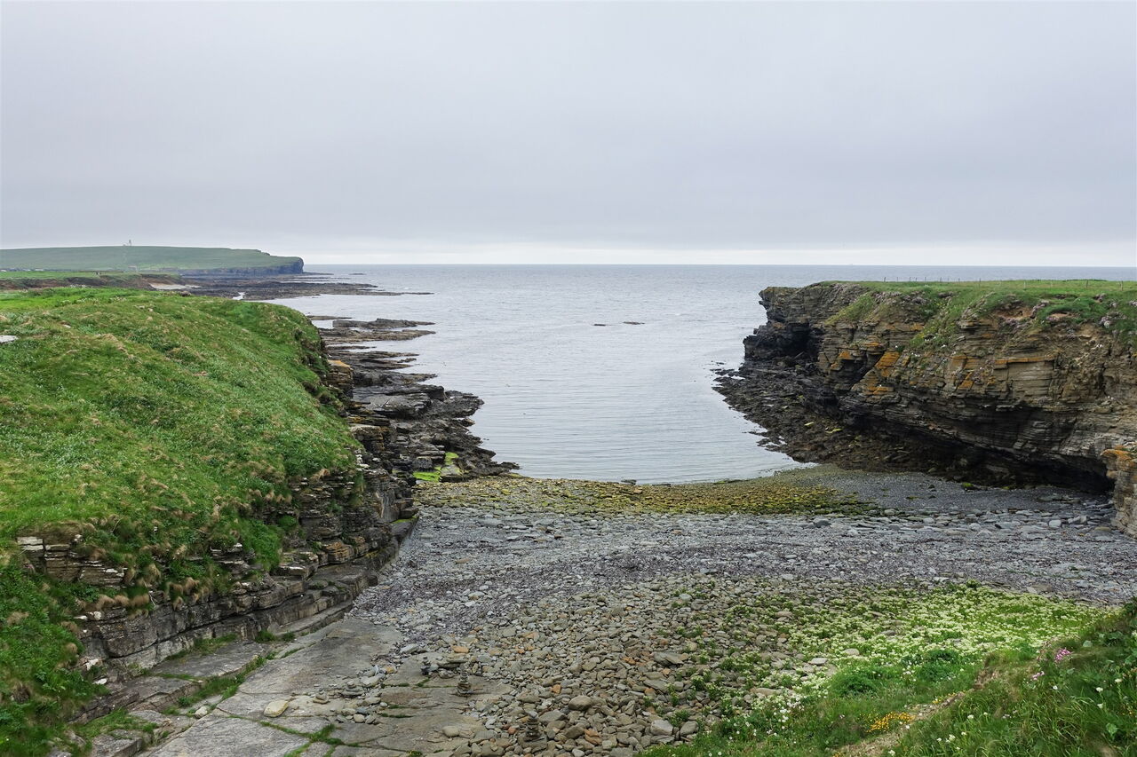 Vom Parkplatz gehen wir direkt über das Kirchengelände an der Kirche vorbei. Durch die kleine Pforte gelangen wir an die Küste, an der wir rechts oberhalb der Klippen entlang der 01 geschützten Bucht (1 m) wandern. Bei einer passenden Stelle steigen wir zum Strand herunter und gehen durch das große Halbrund der Bucht. Es geht über platt geschliffene Steine, Seetang und Sand, bis wir die Slipanlage von Birsay erreichen. Von dort ist bereits der betonierte Weg durch die Meeresenge zu erkennen.