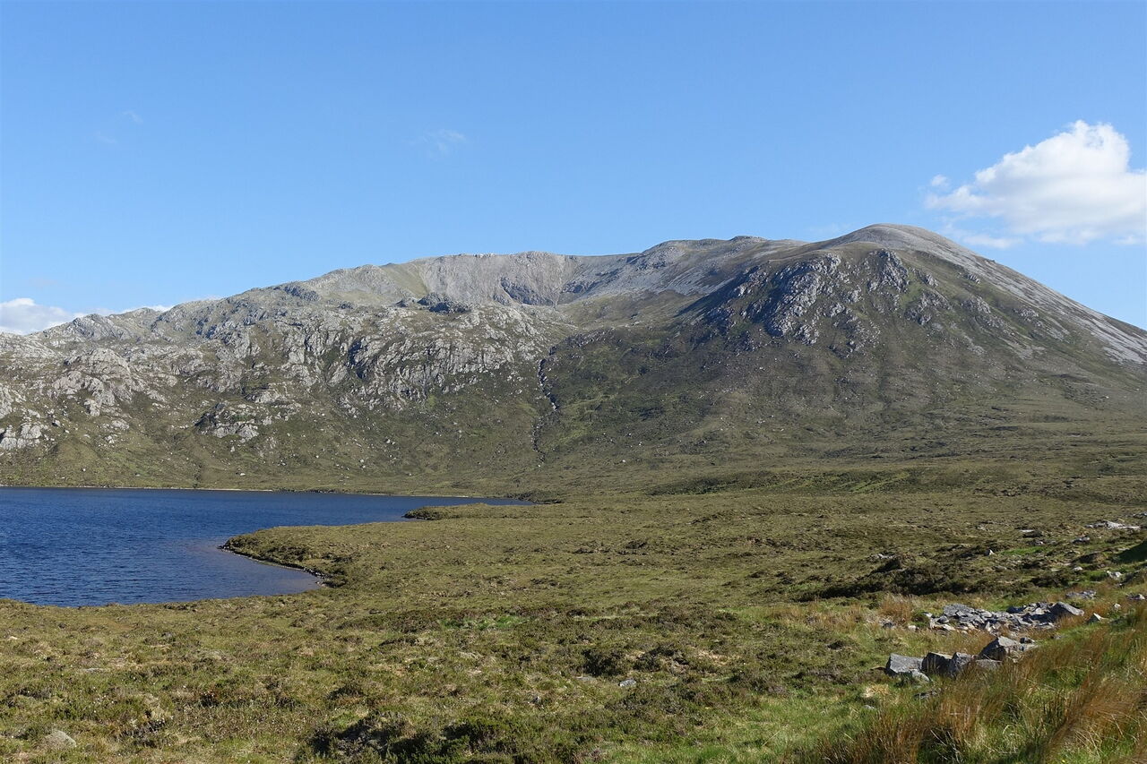 Auf der darauffolgenden Hochebene gehen wir über platt geschliffene Steine bis zum Gipfel des 05 Glas Bheinn (776 m). Zur weiteren Wegbeschreibung: Blickt man vom Gipfel Richtung Osten, so sieht man auf der rechten Seite des Gipfelplateaus einen Steinhaufen. Wir queren die Hochebene ca. 100 m links von diesem Steinhaufen. Danach erreichen wir die östliche Bergflanke des Glas Bheinn, an dessen Grat wir bis zu einer kleinen Senke bergab gehen. An dieser orientieren wir uns halb rechts und gehen ein kleines Stückchen bergauf, um dann auf dem lang gezogenen Bergrücken weiter abzusteigen – auf einem Pfad, der nur schwer auszumachen ist. Bei einer kleinen Einsattelung und einem Steinmännchen fangen wir an, links durch eine steile grasige Rinne in Richtung des im Tal querenden Pfads herabzusteigen. Von dort gehen wir rechts Richtung Straße und Parkplatz.