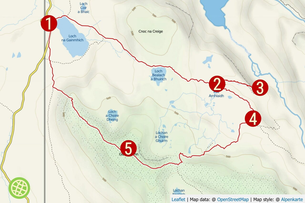 Vom 01 Start und Ziel (226 m) verlassen wir das östliche Ende des Parkplatzes erhöht auf den Überresten der alten Fahrspur – oberhalb der Kehre der Straße. Sobald wir freien Blick auf den See halb rechts haben, gehen wir bei einem weißen Stein halb links auf den beginnenden Pfad, der sehr sumpfig sein kann. Über Steine queren wir den Abfluss des Sees und steigen nun weiter auf dem erodierten Pfad auf. Sobald wir den See hinter uns gelassen haben, wird der Weg steiniger und wir erreichen den Loch Bealach a Bhuirich.
