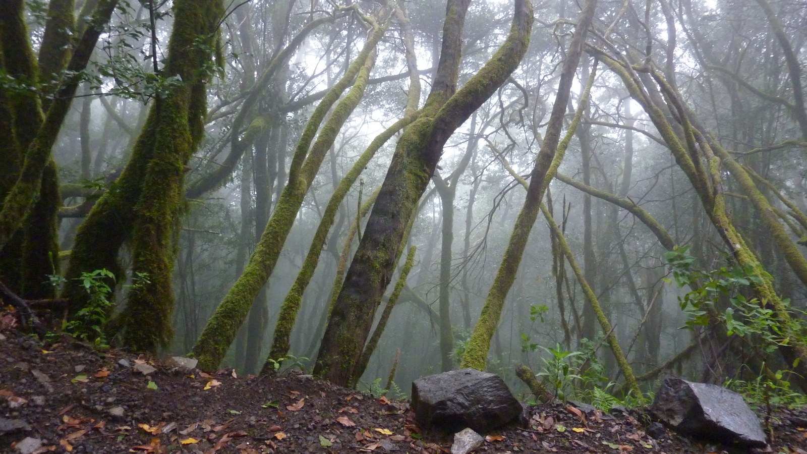 Es folgt ein 2,5 km langes Stück durch den immer tiefer und dunkler werdenden Nebelwald, bis wir nach einer Linkskehre das Barranco del Cedro überqueren. Wir haben den Parkplatz (03) Las Mimbreas (982 m) erreicht.
