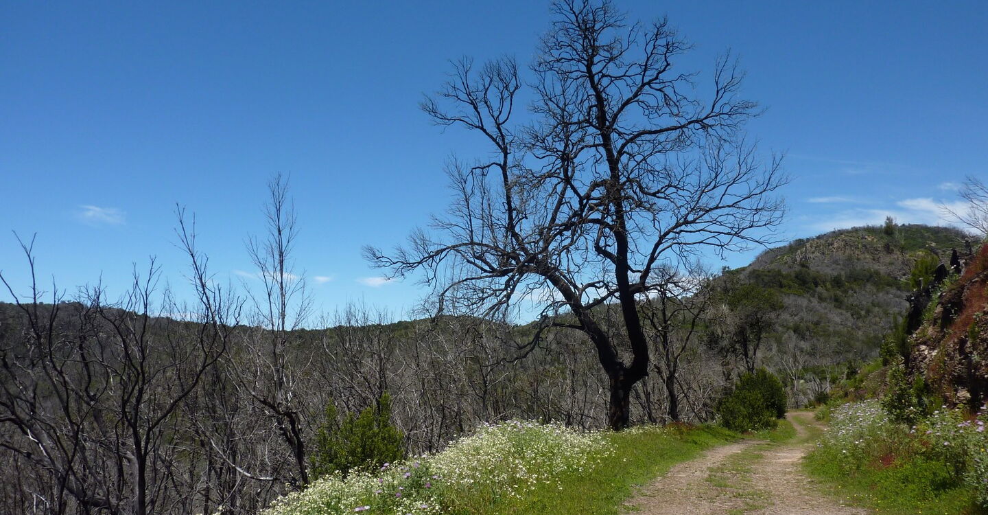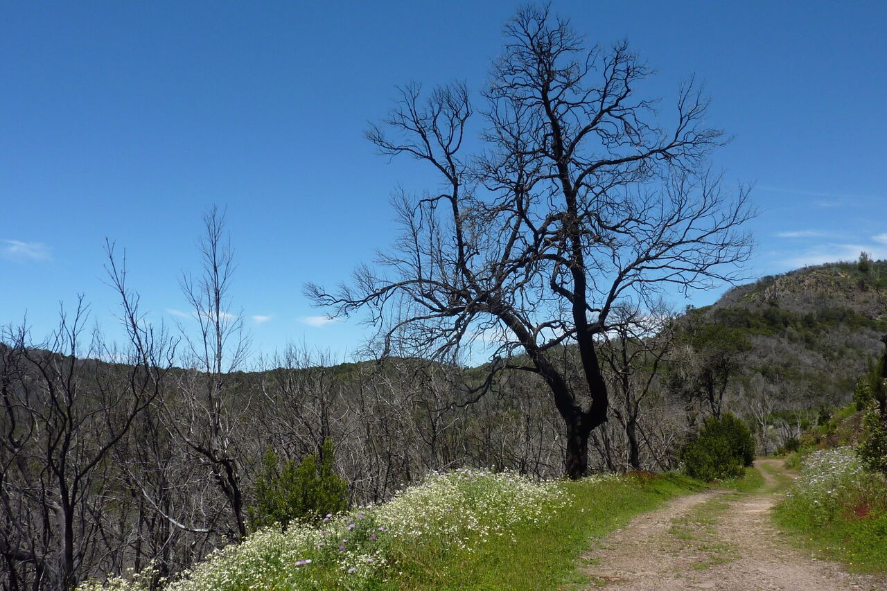 Wir erreichen die GM-2, gehen ein kurzes Stück auf dem beginnenden Forstweg nach links, um dann sofort (02) rechts (1331 m) auf dem hier beginnenden Pfad Richtung Laguna Grande weiterzugehen. Auf dem folgenden Wegstück würden wir normalerweise durch einen dichten Nebelwald gehen, aber nach den letzten Waldbränden wurde dieser leider komplett zerstört - geblieben sind nur die schwarzen verbrannten Stummel. Dieser Umstand gibt wiederum dem Bäumchen-Löwenzahn die Möglichkeit, prachtvolle gelbe Blüten in den Himmel zu strecken.