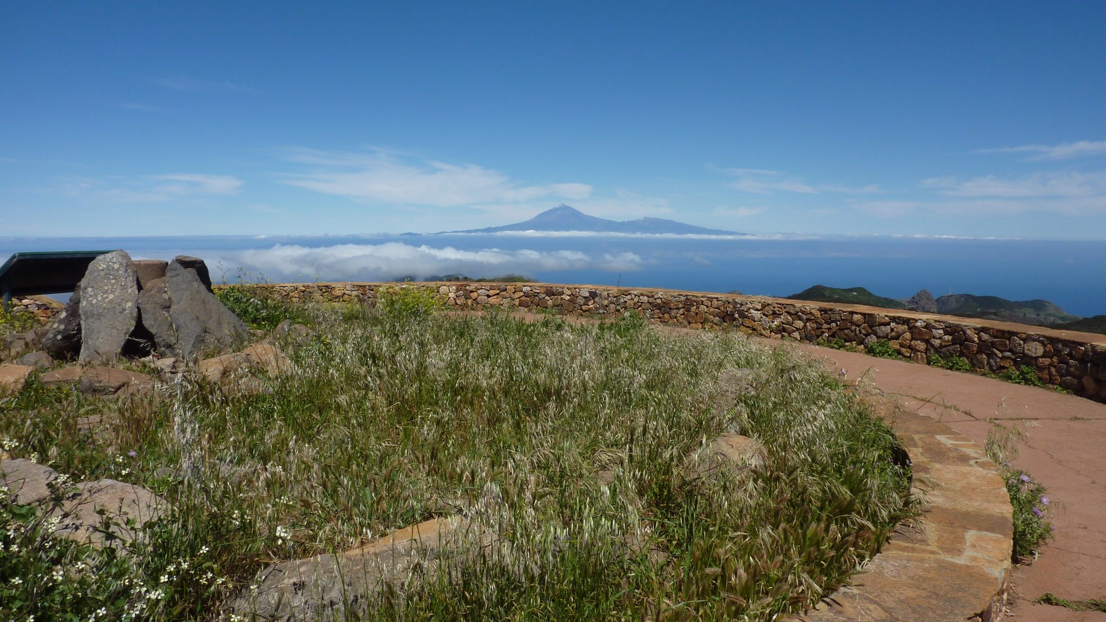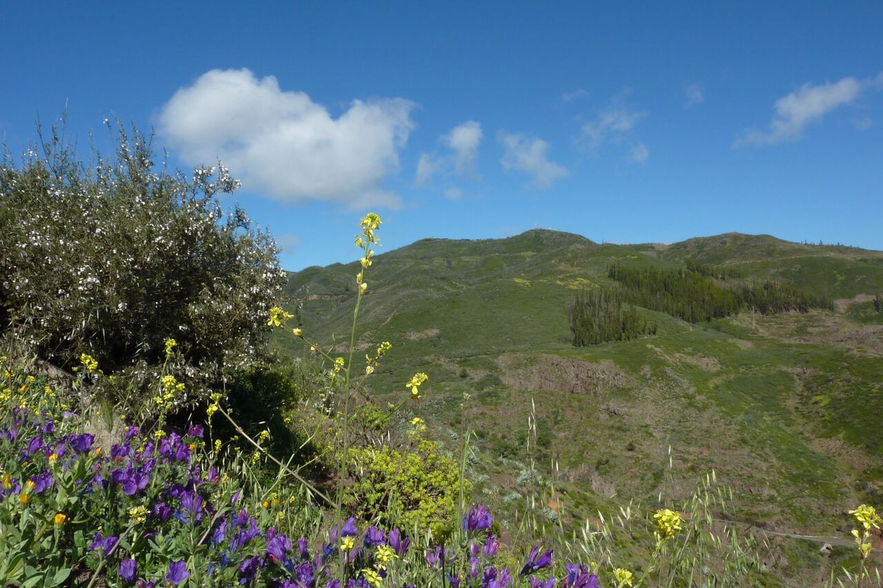 Nach 1,4 km treffen wir auf eine weitere Forststraße, folgen dieser halb links weitere 130 m, um dann bei der Weggabelung scharf rechts auf dem gepflasterten Weg bis zum (05) Alto de Garajoney (1487 m) aufzusteigen. Er ist die höchste Erhebung der Insel und überragt das umliegende Hochplateau um wenige Meter. Auch wenn das Dach von La Gomera daher kein exponierter Gipfel ist, haben wir einen imposanten Ausblick auf die gesamte Insel. Bei guter Sicht kann man sogar die Nachbarinseln Teneriffa, La Palma und El Hierro ausmachen. Oft hüllen aber fette Passat-Wolken die Bergspitze ein. Wir überschreiten den Gipfel und laufen auf einem Bergrücken in nordöstlicher Richtung, bis in einer Mulde links ein Pfad abzweigt. Nach 50 m gelangen wir auf den gepflasterten Weg, um auf diesem rechts herunter bis zum Ausgangspunkt laufen.