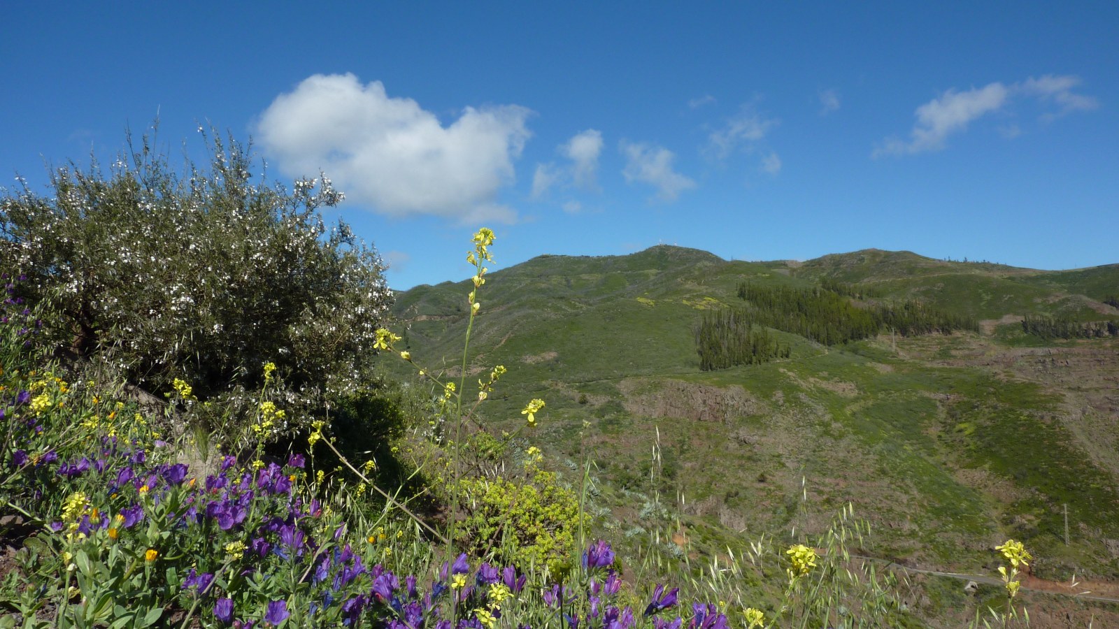 Wir gehen ein paar Stufen herunter und treffen auf einen Forstweg, an dem wir (03) links (1272 m) Richtung Alto de Garajonay weiterwandern. Ein Auto-Navigationssystem würde an dieser Stelle sagen: Bitte nehmen Sie die dritte Ausfahrt. Bei der folgenden Weggabelung halten wir uns rechts Richtung Chipude. Der Weg endet bei einer Einsattelung und wir wandern links auf der Schotterstraße weiter, bis auch diese endet.