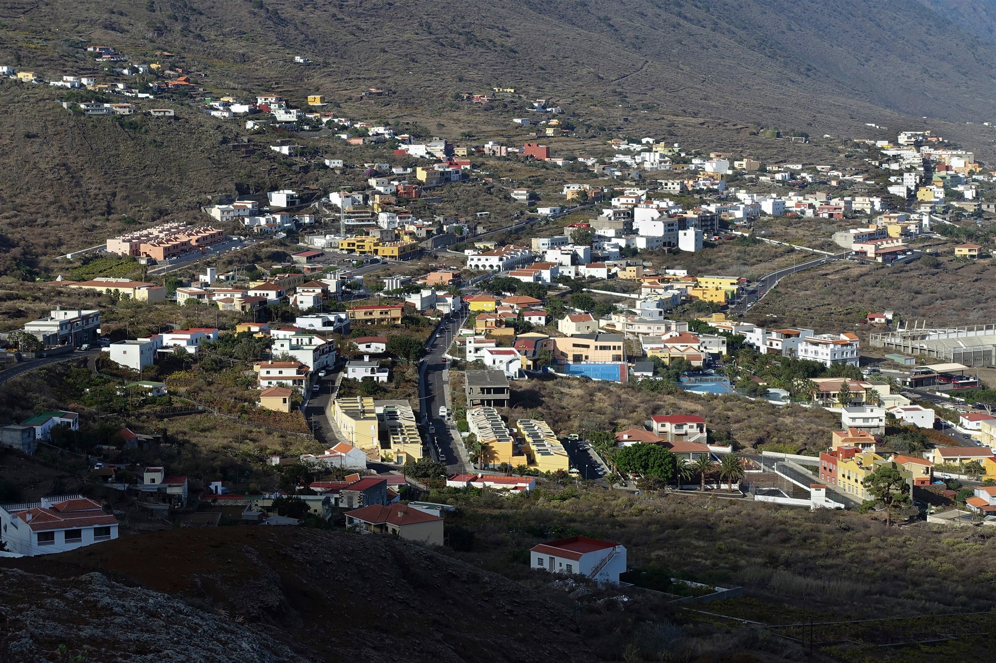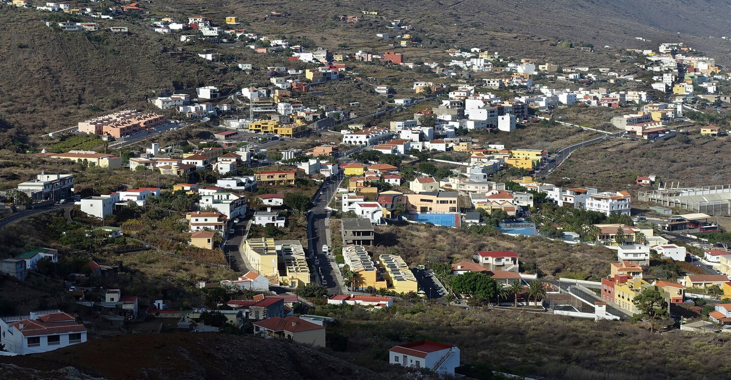 Die Forstpiste endet und wir gehen kurz links auf der querenden Piste, um dann sofort rechts den Abstieg fortzusetzen. Kurz vor dem Campingplatz queren wir die Straße nach El Julan und gehen halb links auf der Schotterpiste vom Campingplatz, bis diese sich gabelt. Wir gehen nun links, auch ausgeschildert Richtung Las Casas. Die nachfolgende Asphaltstraße begehen wir talauswärts und vor dem rechten Abzweiger zur Aula Naturaleza gehen wir links weiter. Die Straße endet und wir gehen halb links 100 m bis zur Verbindungsstraße von San Andres nach El Pinar, überqueren diese und erreichen (04) Las Casas (851 m). Bei einem Verkehrsspiegel endet die Straße. Wir halten uns links und wählen beim Dorfplatz die rechte der beiden bergab führenden Straßen.