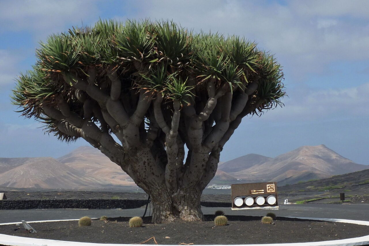 Von dem Platz mit dem großen Drachenbaum in (01) La Geria (319 m) gehen wir zunächst in östlicher Richtung auf der LZ-30. 150 m hinter der Bodega Stratvs - mit wunderschönen alten Eukalyptusbäumen - biegen wir rechts, bei einem weißen Haus mit grüner Tür, in die Straße mit schwarzem Lavagranulat ein. Die nachfolgende Einfahrt nach rechts mit den 2 weißen Pfosten lassen wir liegen und passieren eine gelb angemalte Finca, die links von uns liegt.
