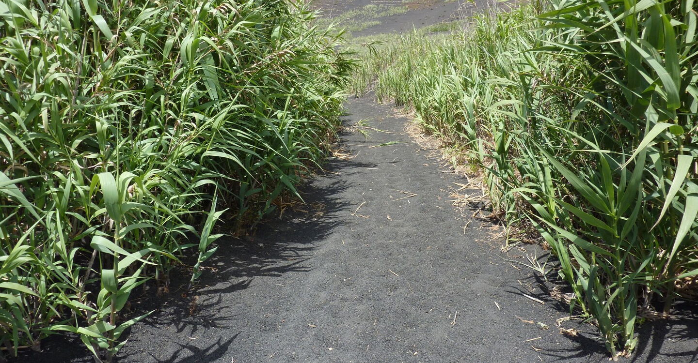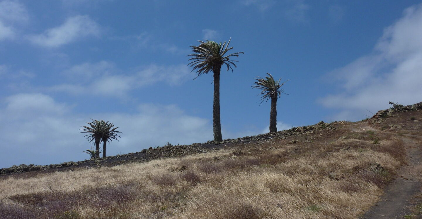 Nach einer kleinen Anhöhe zweigt bei einem halbhohen Wegweiser der Inselregierung (02) (361 m) rechts ein Weg an einem weißen Haus mit grauer Tür ab. Der Weg geht nun steil bergauf und das weiche Lavagranulat erschwert das Gehen. Nach 340 m endet der Weg und wir gehen rechts für weitere 500 m, bis wir zu einem vereinzelt stehenden Haus auf der linken Straßenseite kommen. Hier verlassen wir den Hauptweg hinter uns und gehen rechts in südliche Richtung. Bereits nach 50 m nehmen wir den Abzweiger nach rechts und gehen an einem verlassenen Haus vorbei. Der Weg führt uns nun in Richtung vereinzelt stehender Palmen, die etwas erhöht im vor uns liegenden Hang stehen.