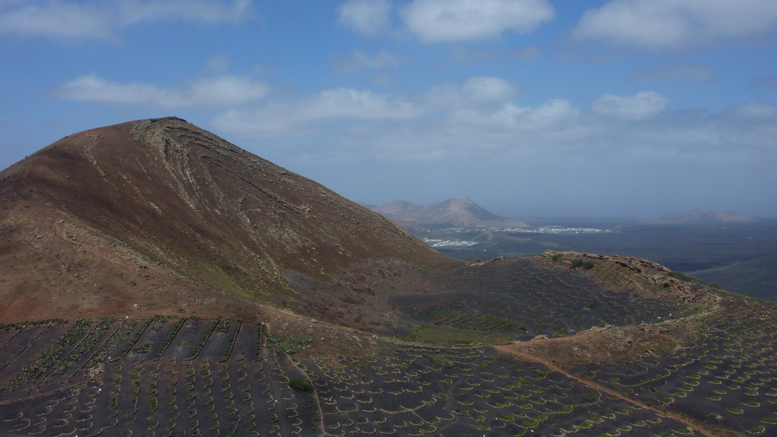 Bevor der Weg auf dem Grat wieder an Höhe gewinnt, gehen wir zunächst rechts bergab, um dann parallel oberhalb eines weiteren Kakteenfelds mit Weinreben im Hintergrund zu gehen. Hinter diesem Feld fällt der Weg rechts steil ab zur Einsattelung zwischen den beiden Vulkanen. Von hier aus führt ein klar erkennbarer Pfad direkt zur (04) Montaña de Guardilama (603 m).