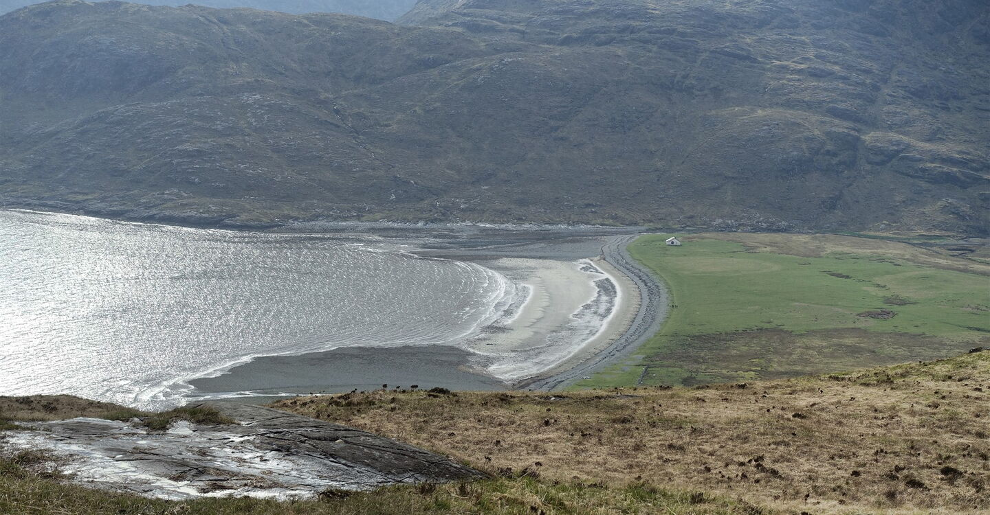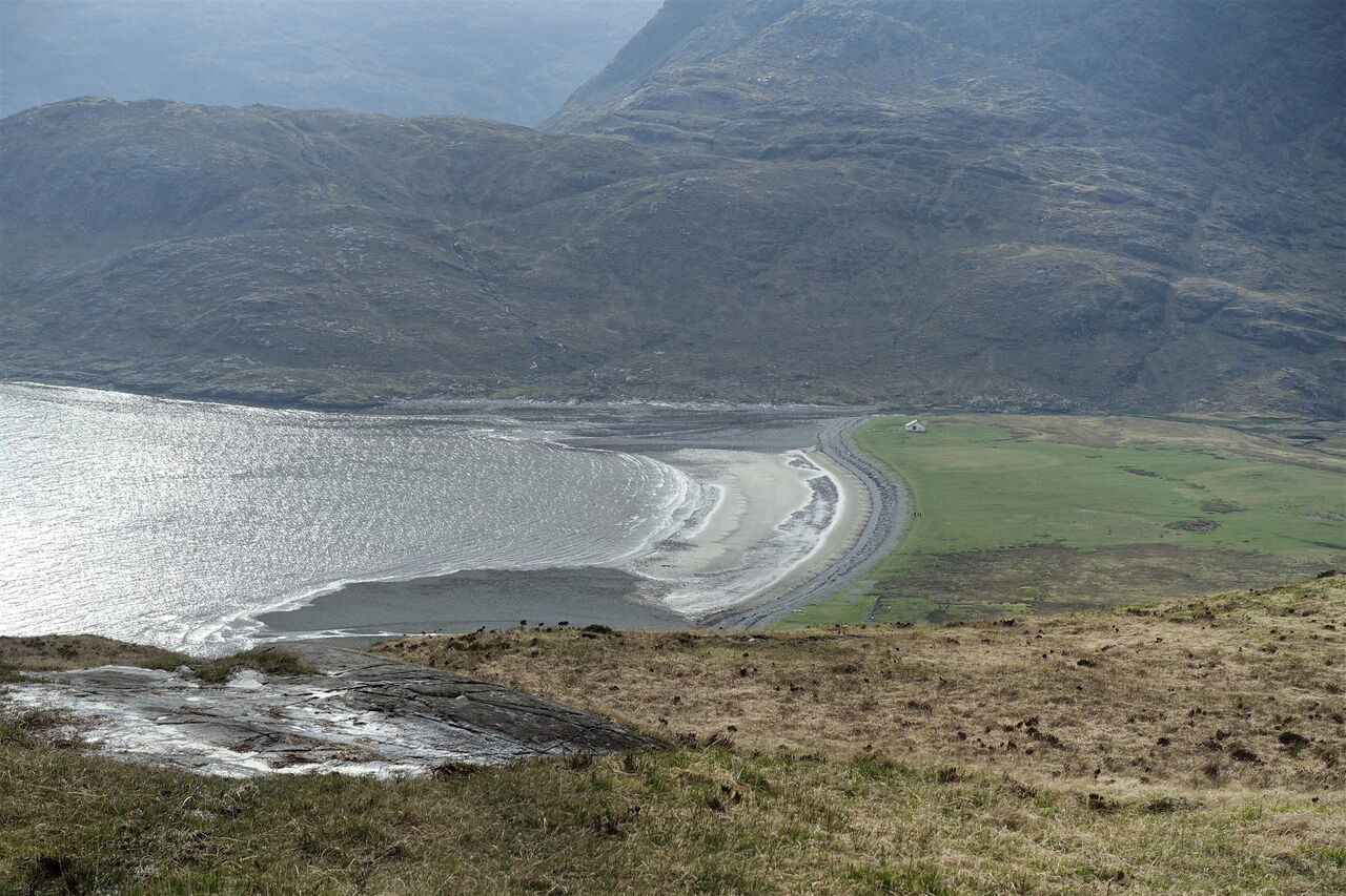 Dort folgen wir dem ausgezeichneten und perfekt angelegten Wanderweg Richtung Camasunary-Bucht. Sobald man den Mam Pass erreicht hat, ergibt sich eine herrliche Aussicht auf die felsige Gebirgslandschaft der Cuillins. Bei guter Sicht lässt sich der höchste Gipfel der Cuillins und der Insel Skye, der 992 m hohe Sgùrr Alasdair, ausmachen. Nach dem Abstieg erreichen wir die 03 Camasunary Bay (14 m). Sattgrüne Weiden und eine hellsandige Bucht stehen im Kontrast zu den schwarzen Gipfeln des Cuillin-Hauptkamms.