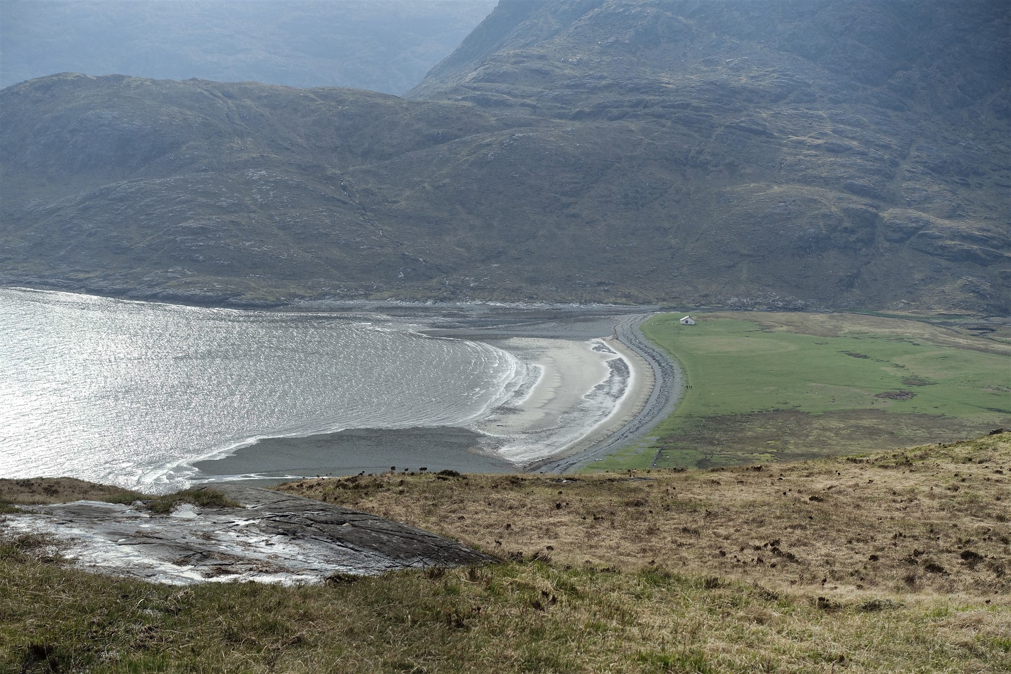 Wir folgen dem weiteren Pfad Richtung Süden entlang der Küste, der zunächst etwas sumpfig ist, sich aber bald verbessert, nachdem er die grasbewachsenen Hänge erklimmt. Windflüchter berichten von windigen Zeiten. Unterhalb des Berges Beinn Leacach führt der Weg steil oberhalb der Klippen entlang. An wenigen Stellen muss man schwindelfrei sein. Es erfolgt der Abstieg in die 04 Schlucht Scaladal (5 m). Hinter der Schlucht steigt der Weg wieder in schwindelerregende Höhen auf.