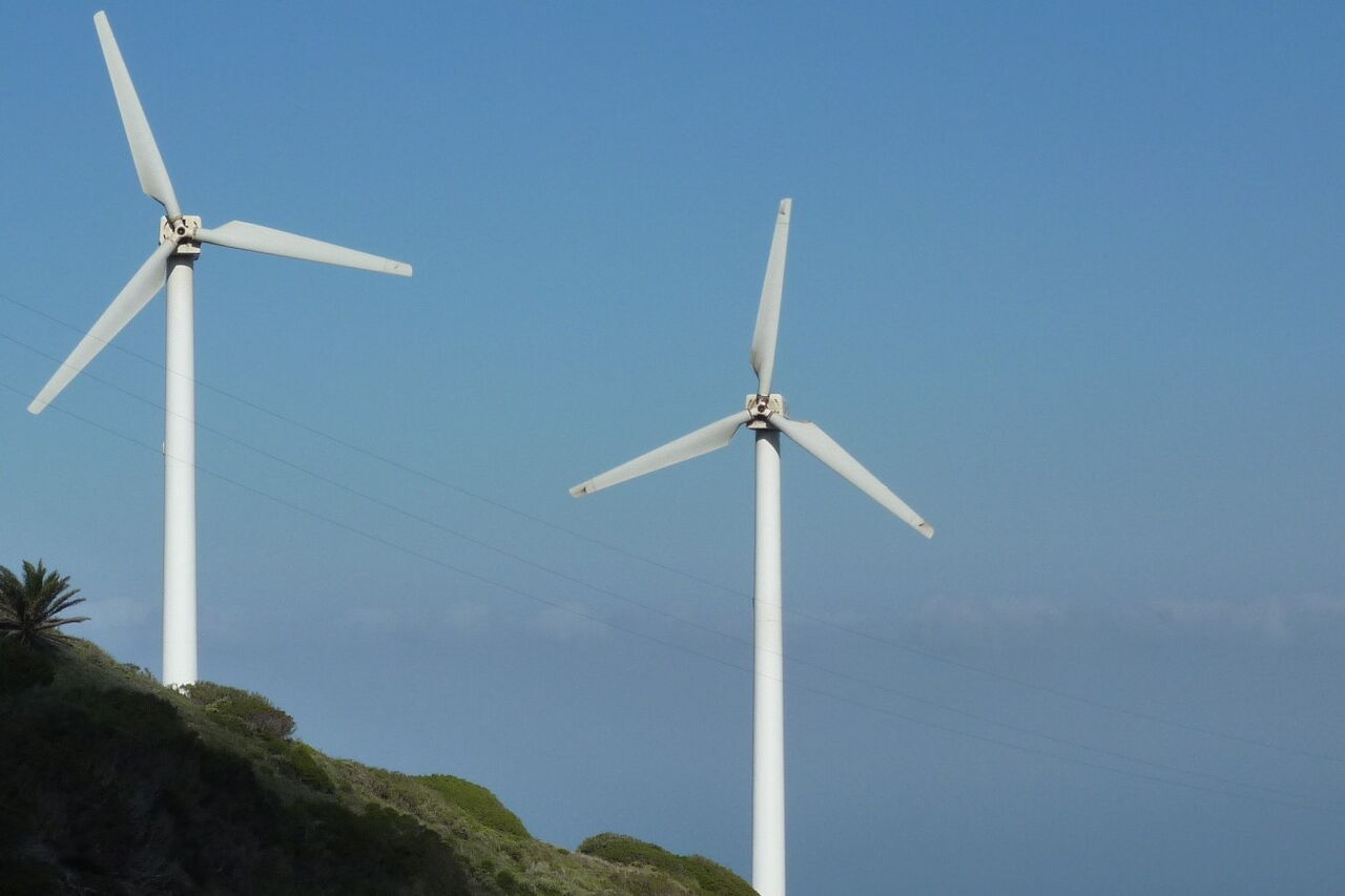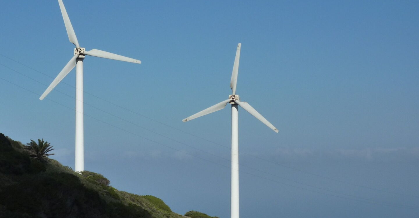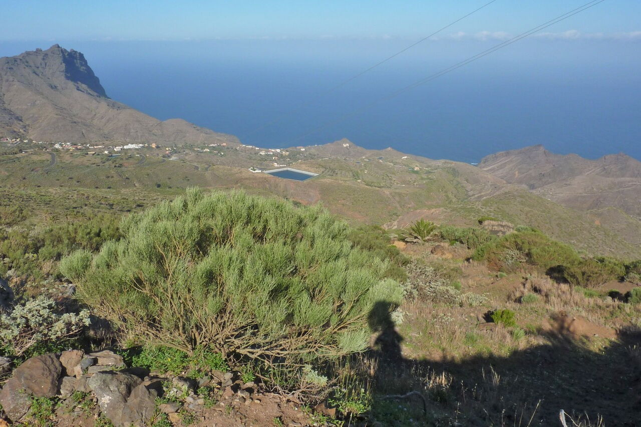 Bereits hinter den links von uns liegenden Windrädern macht die Straße eine Linkskehre. Nach 50 m treffen wir auf eine Öffnung in der Leitplanke. Hier wandern wir den beginnenden gelb-grün markierten Wanderweg rechts herunter, auf dem (02) Lomo del Espino (648 m). Bei immer wieder schönen Blicken in das vor uns liegende Tal von Alojera erreichen wir schlussendlich eine Schotterpiste, an der wir links gehen und sofort wieder dem rechten Abzweiger folgen.