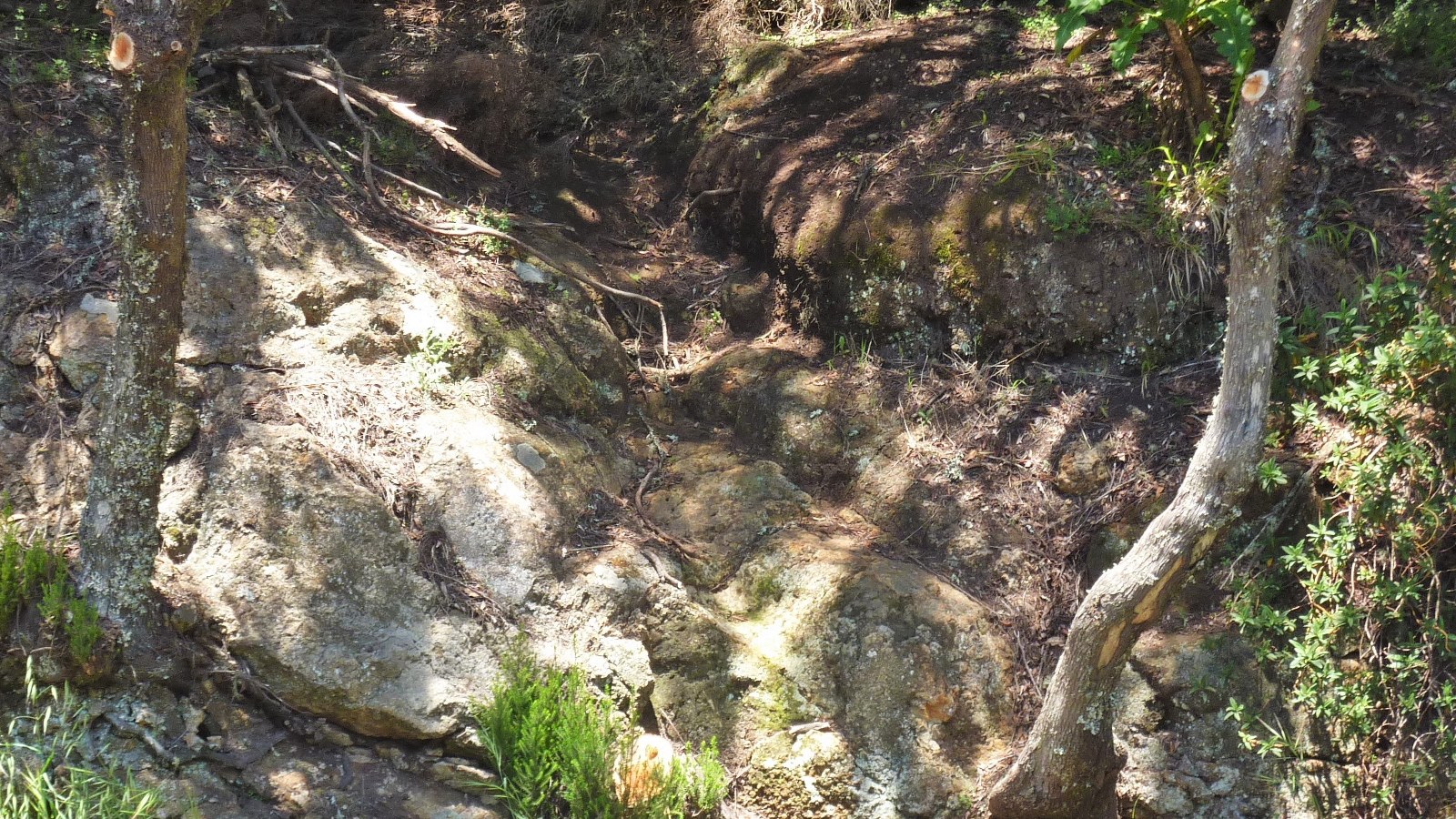 Aufgrund der windgeschützten Lage, und dass es keine Waldbrände in der jüngeren Vergangenheit gab, führt die Wanderung auf diesem Abschnitt durch den ältesten Baumbestand auf La Gomera. Nach 380 m vernimmt man das Plätschern eines Baches, und dann plötzlich taucht er aus dem Dickicht der Bäume auf, ein riesiger, 7 × 12 m großer (04) Fels (803 m). Geht man rechts oder links am Felsen vorbei, befinden sich dort noch weitere Felsen, aber nicht zu mächtig wie der am Wegesrand.